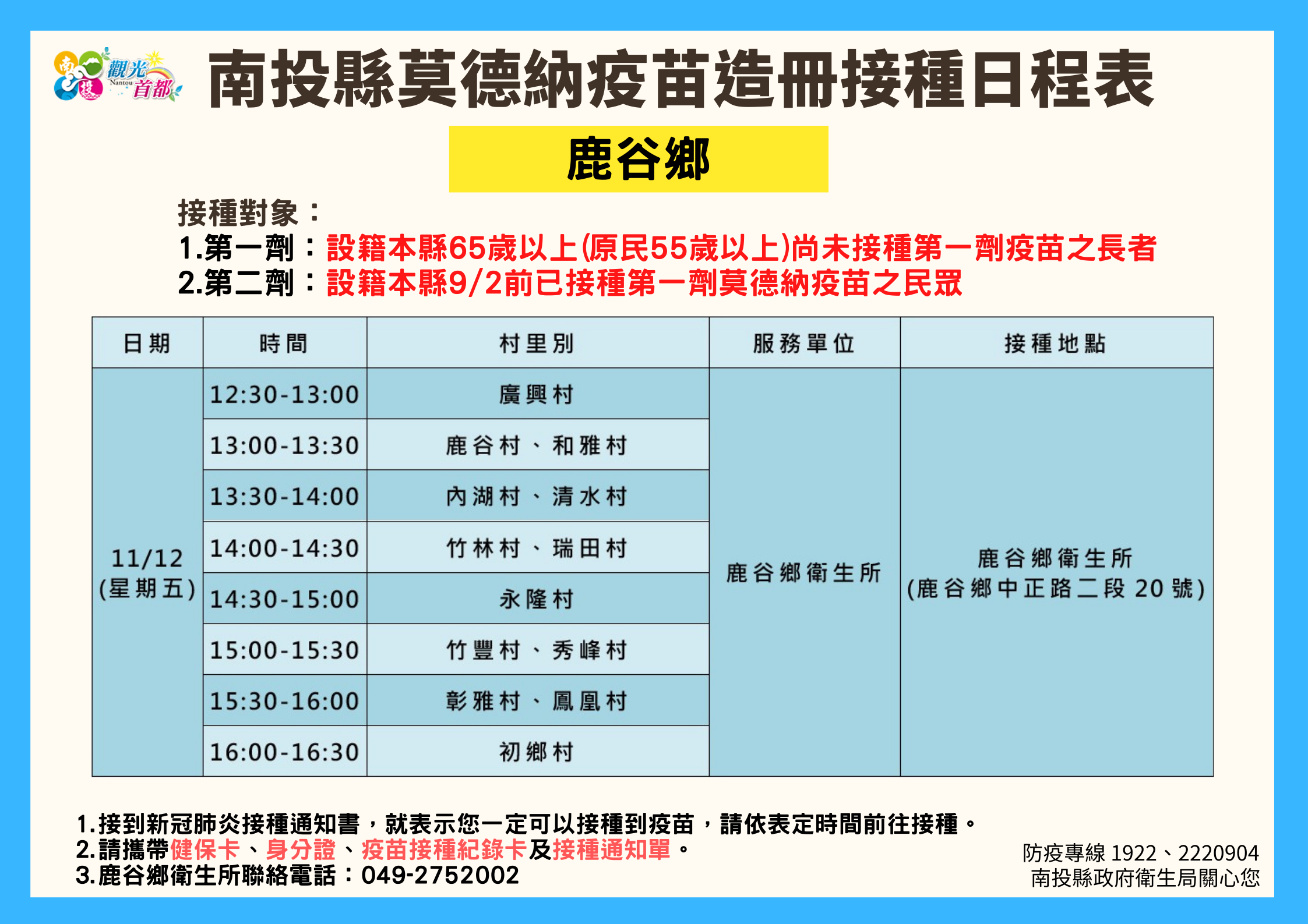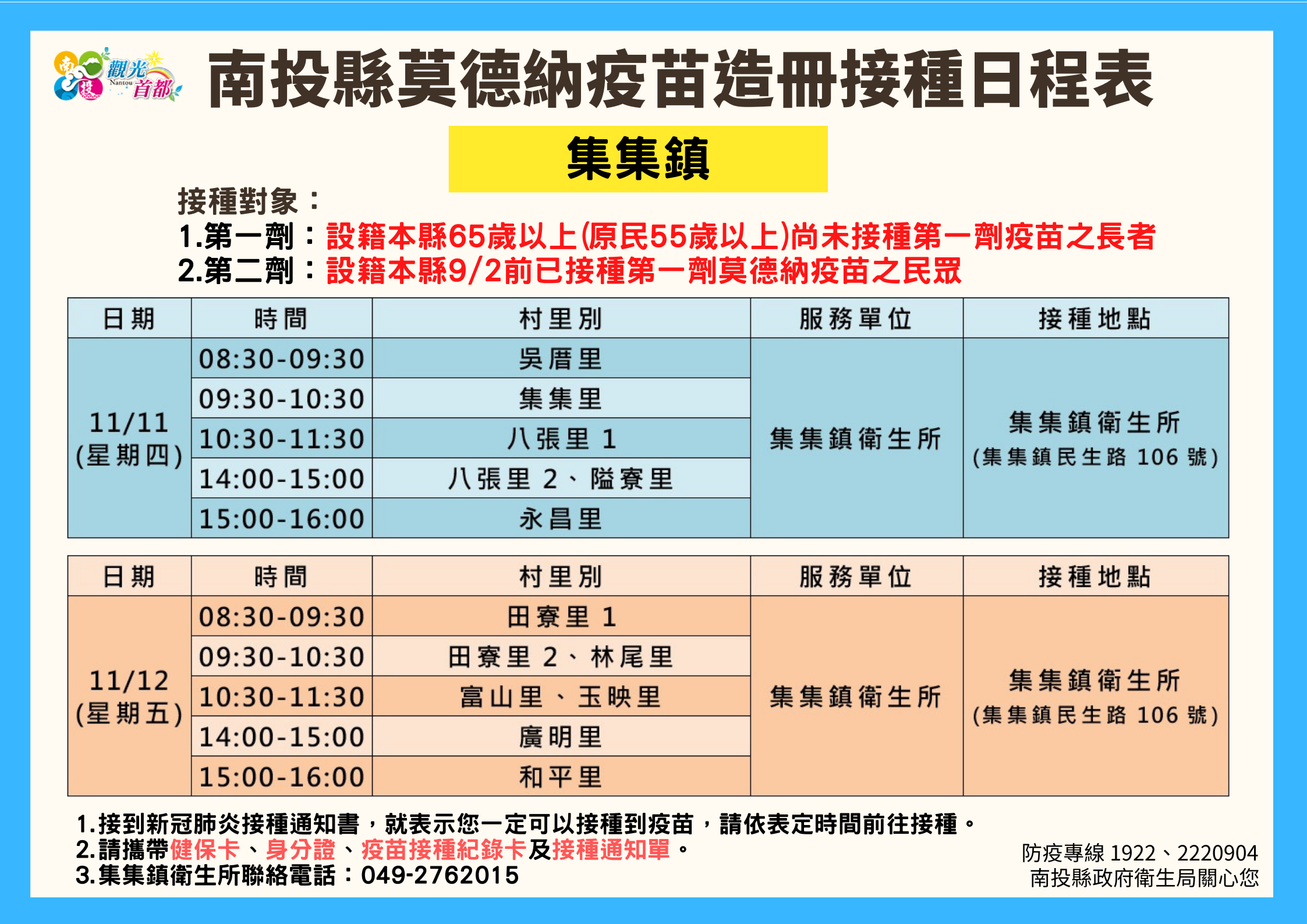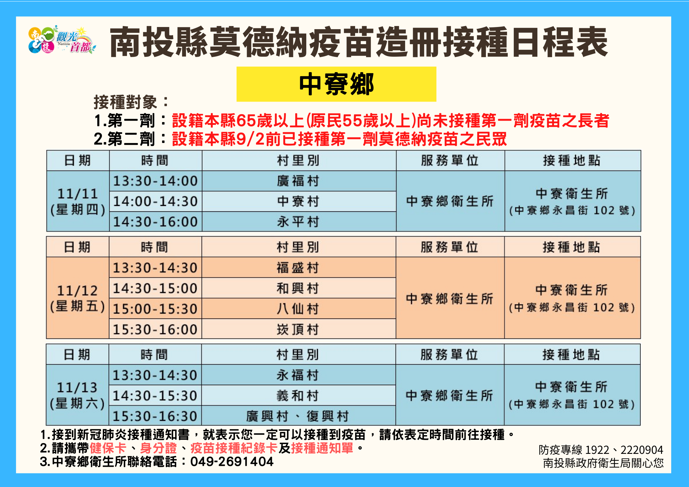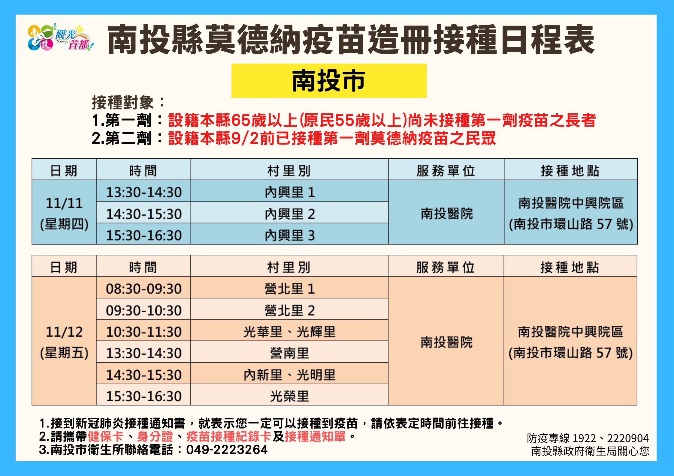 防疫宣傳 居家照護關懷手冊 防疫補助 勞工紓困 農漁畜牧 觀光紓困 企業紓困 租稅紓困 藝文紓困 中央各部會防疫專區 首頁 防疫宣傳 南投縣各鄉鎮市莫德納... 南投縣各鄉鎮市莫德納疫苗造冊接種日程表 公佈單位:新聞及行政處 發佈日期:110/11/10