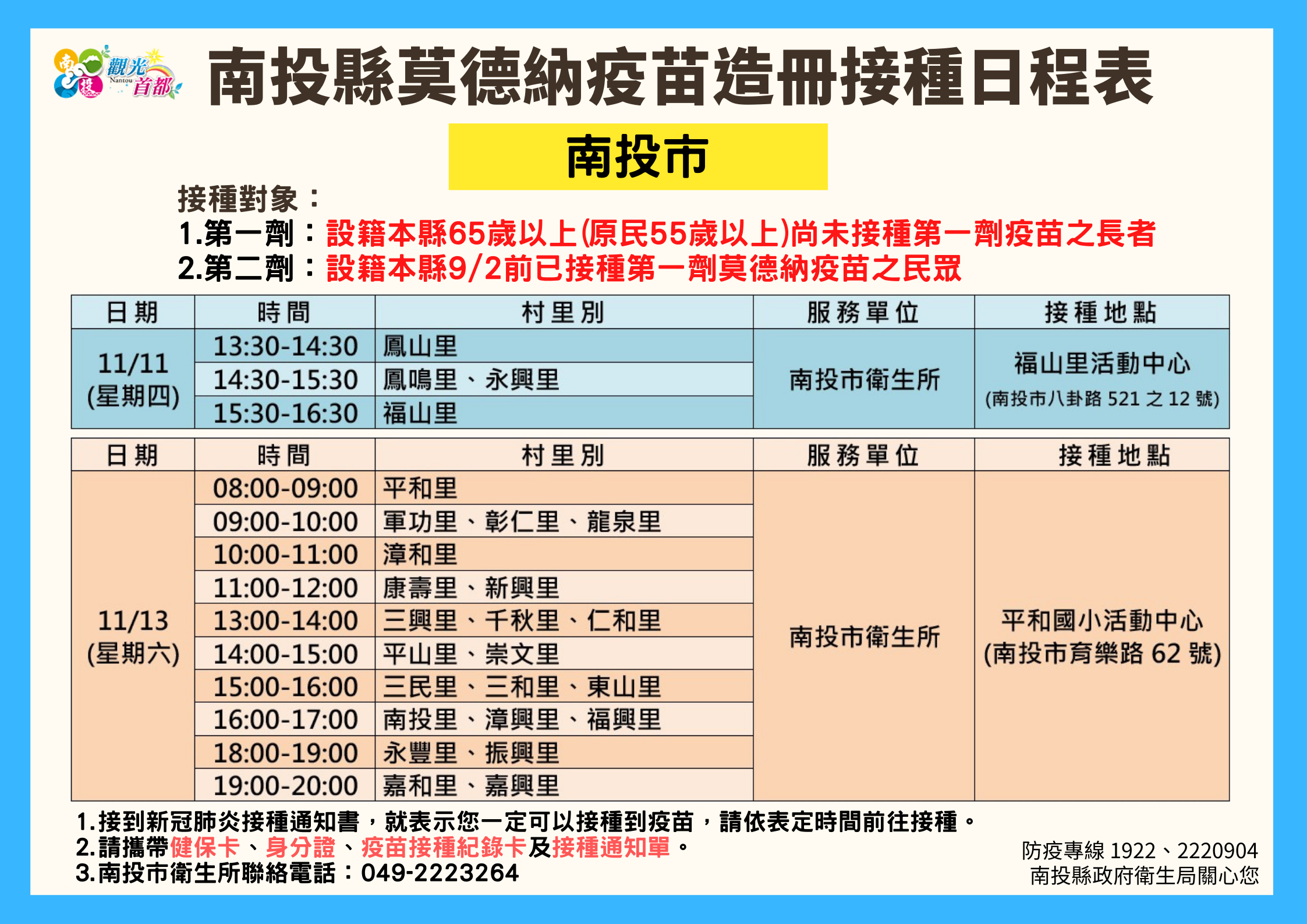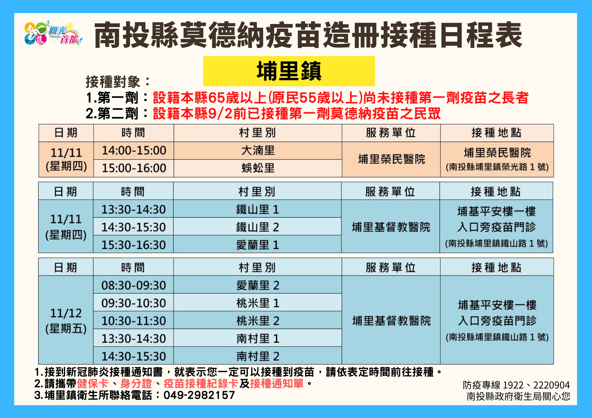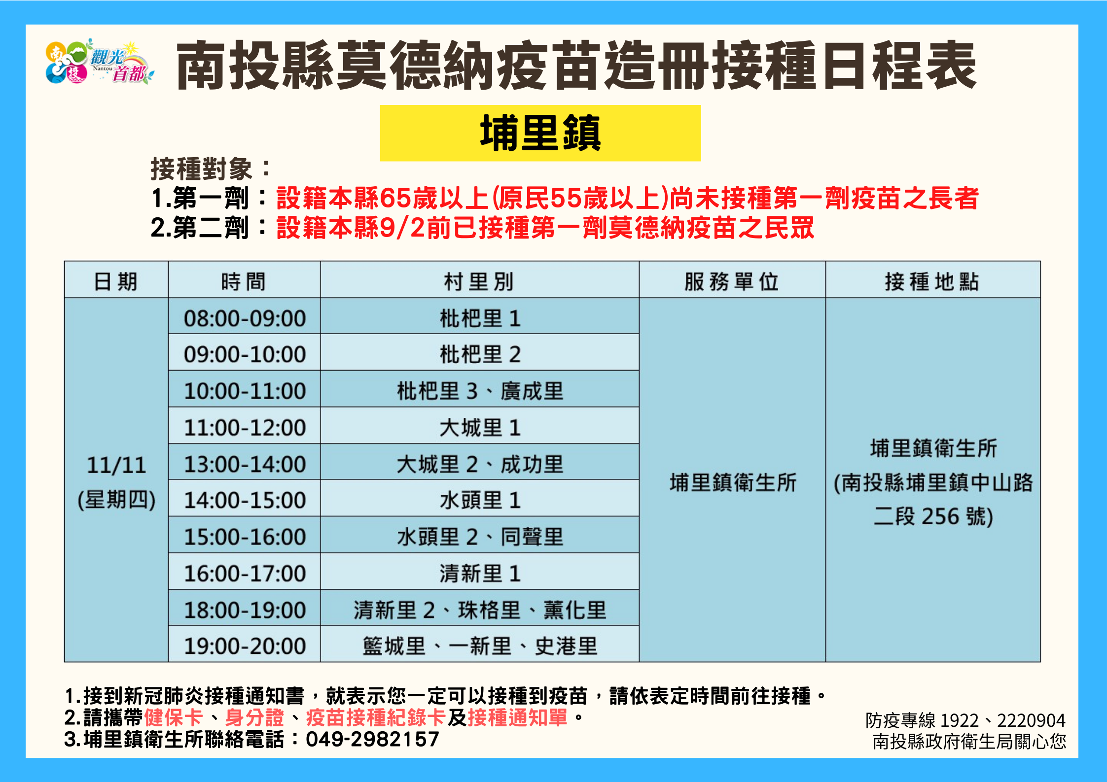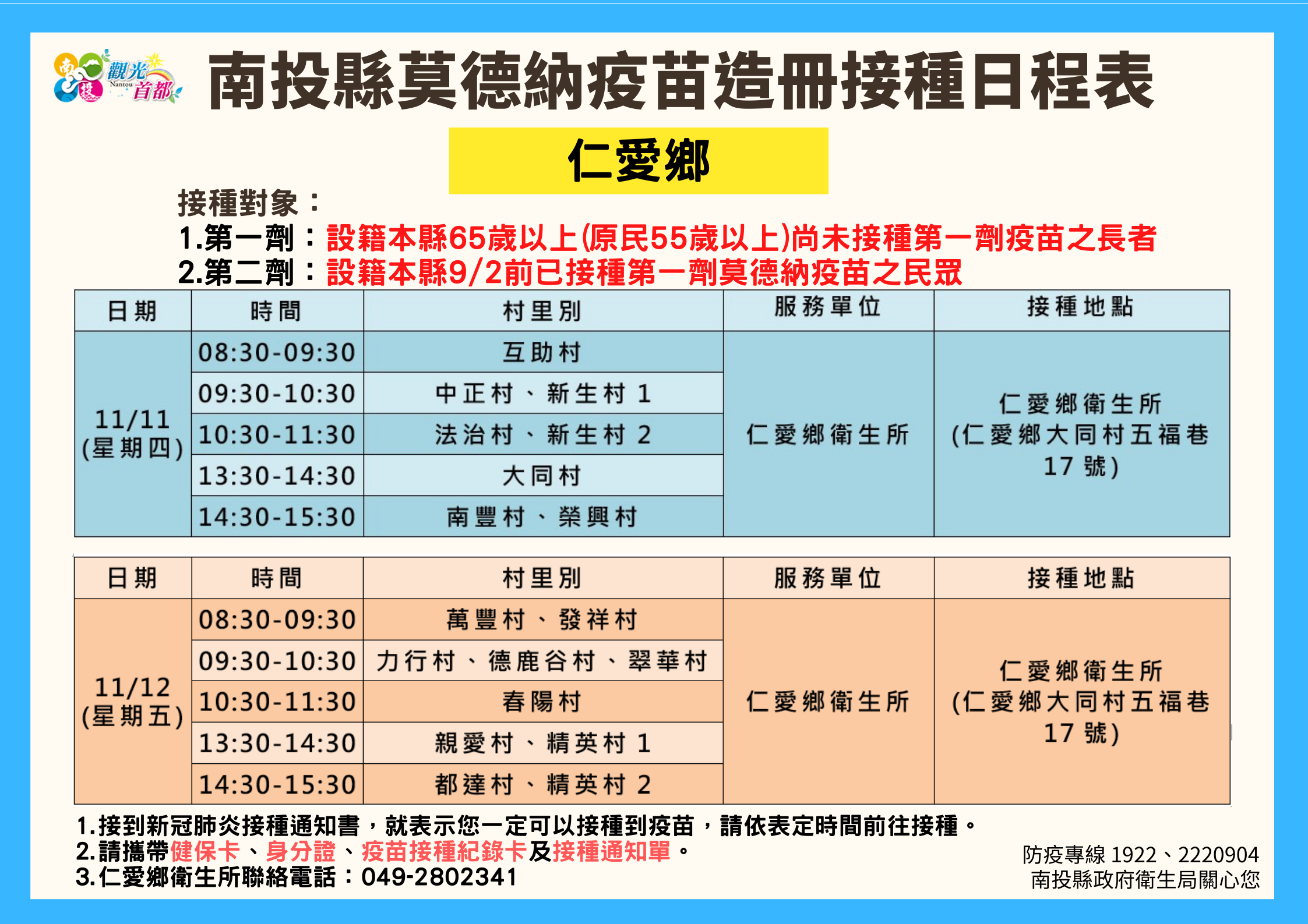 防疫宣傳 居家照護關懷手冊 防疫補助 勞工紓困 農漁畜牧 觀光紓困 企業紓困 租稅紓困 藝文紓困 中央各部會防疫專區 首頁 防疫宣傳 南投縣各鄉鎮市莫德納... 南投縣各鄉鎮市莫德納疫苗造冊接種日程表 公佈單位:新聞及行政處 發佈日期:110/11/10