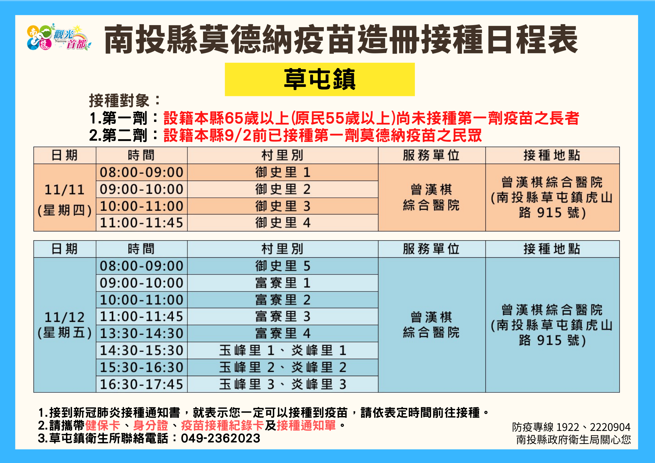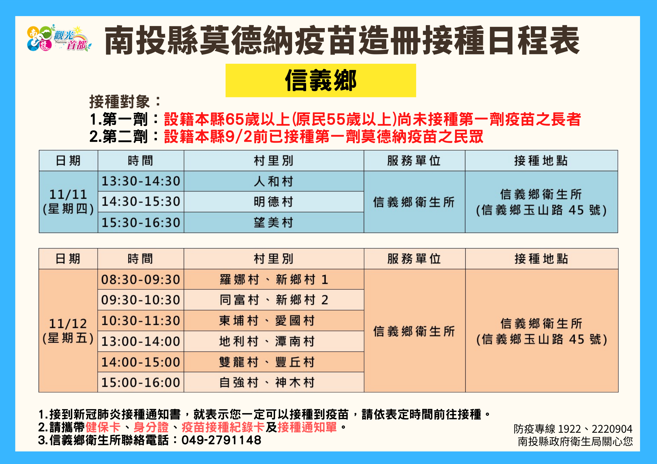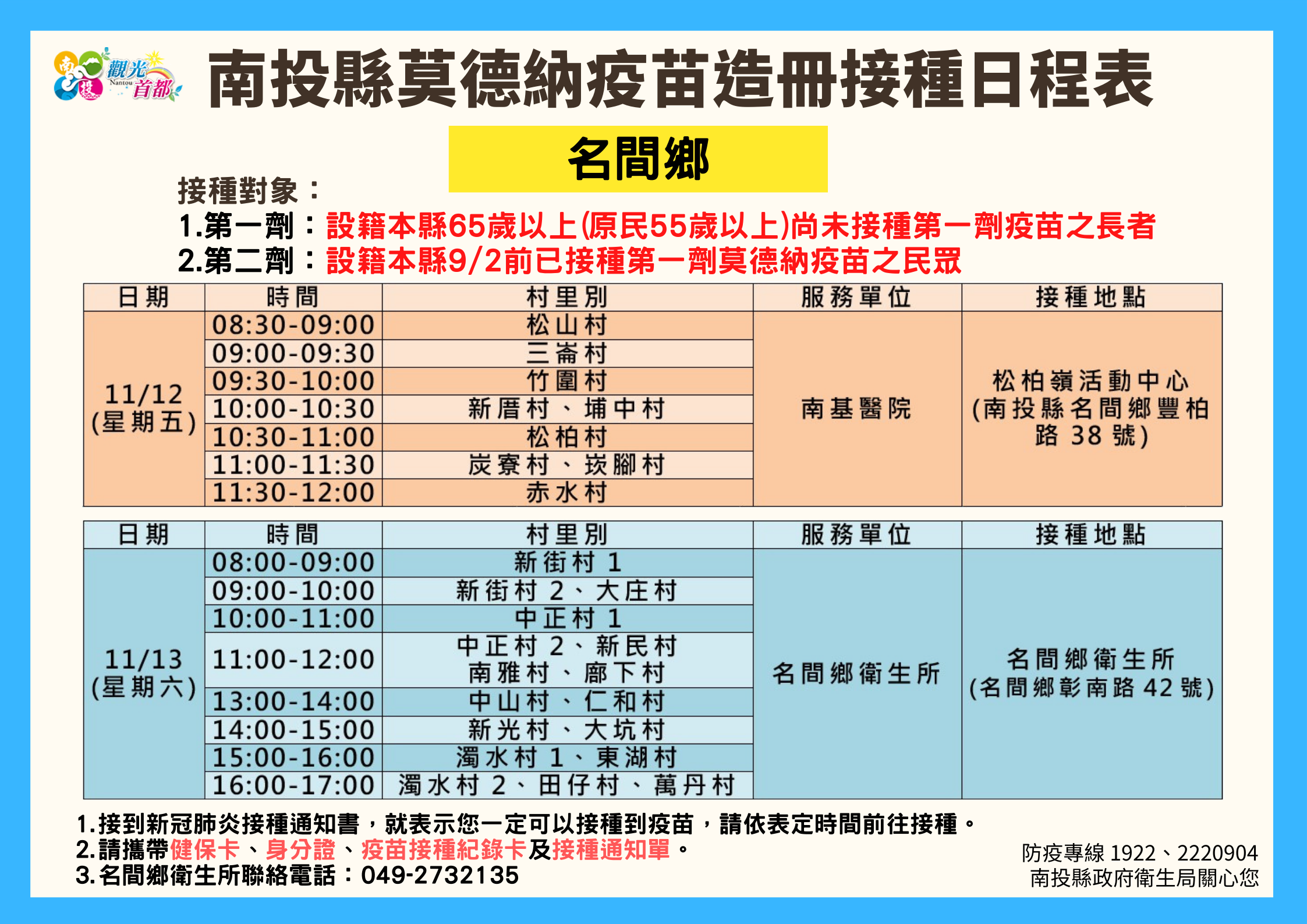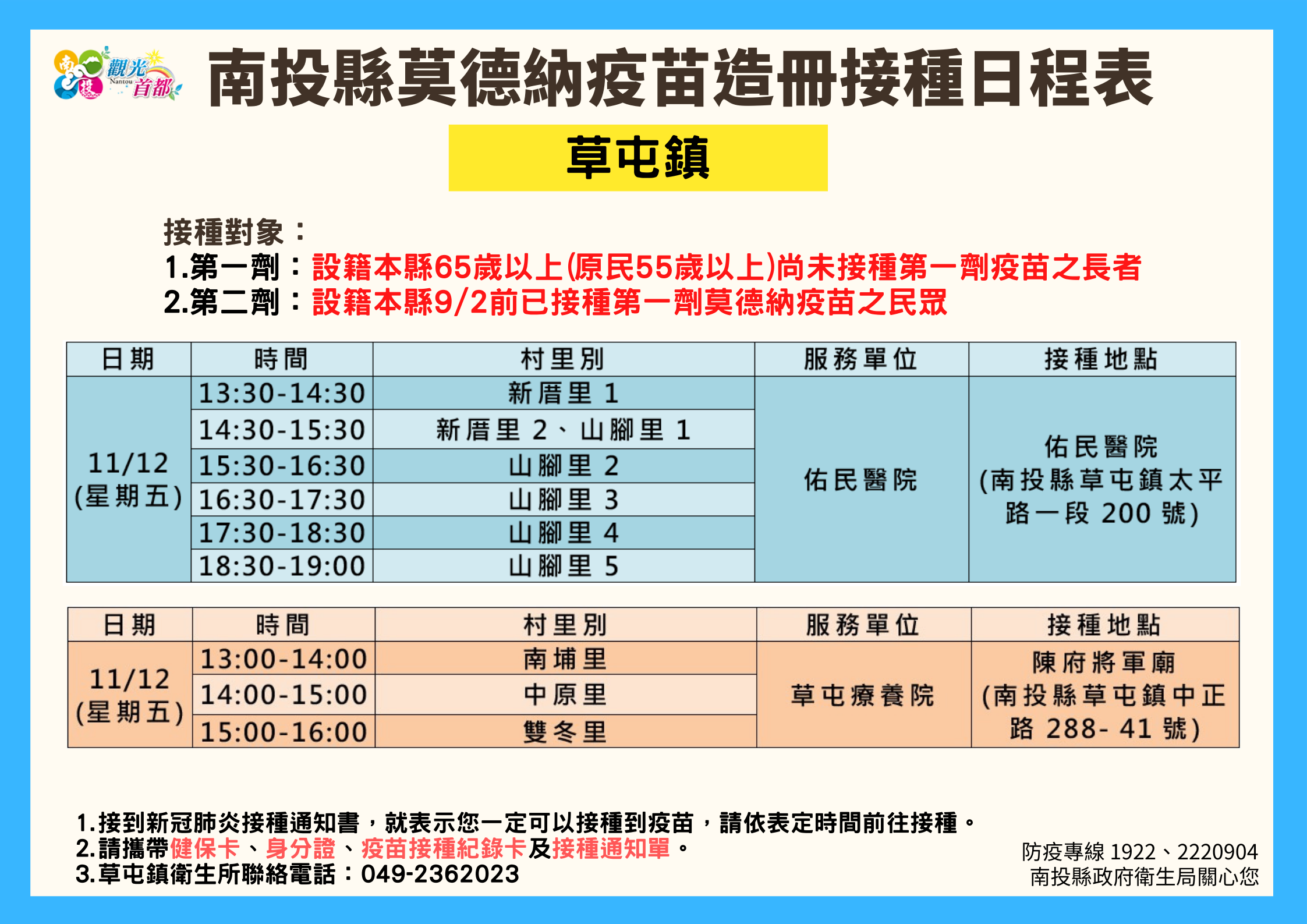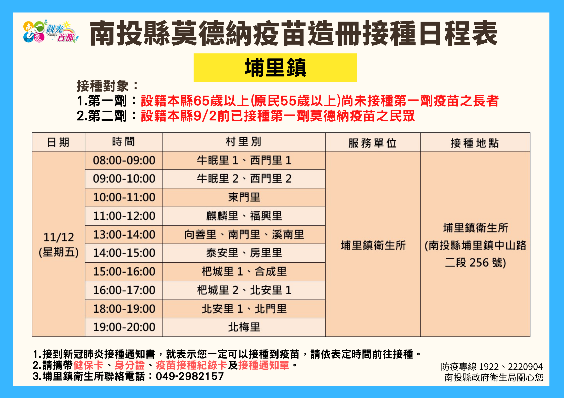 防疫宣傳 居家照護關懷手冊 防疫補助 勞工紓困 農漁畜牧 觀光紓困 企業紓困 租稅紓困 藝文紓困 中央各部會防疫專區 首頁 防疫宣傳 南投縣各鄉鎮市莫德納... 南投縣各鄉鎮市莫德納疫苗造冊接種日程表 公佈單位:新聞及行政處 發佈日期:110/11/10