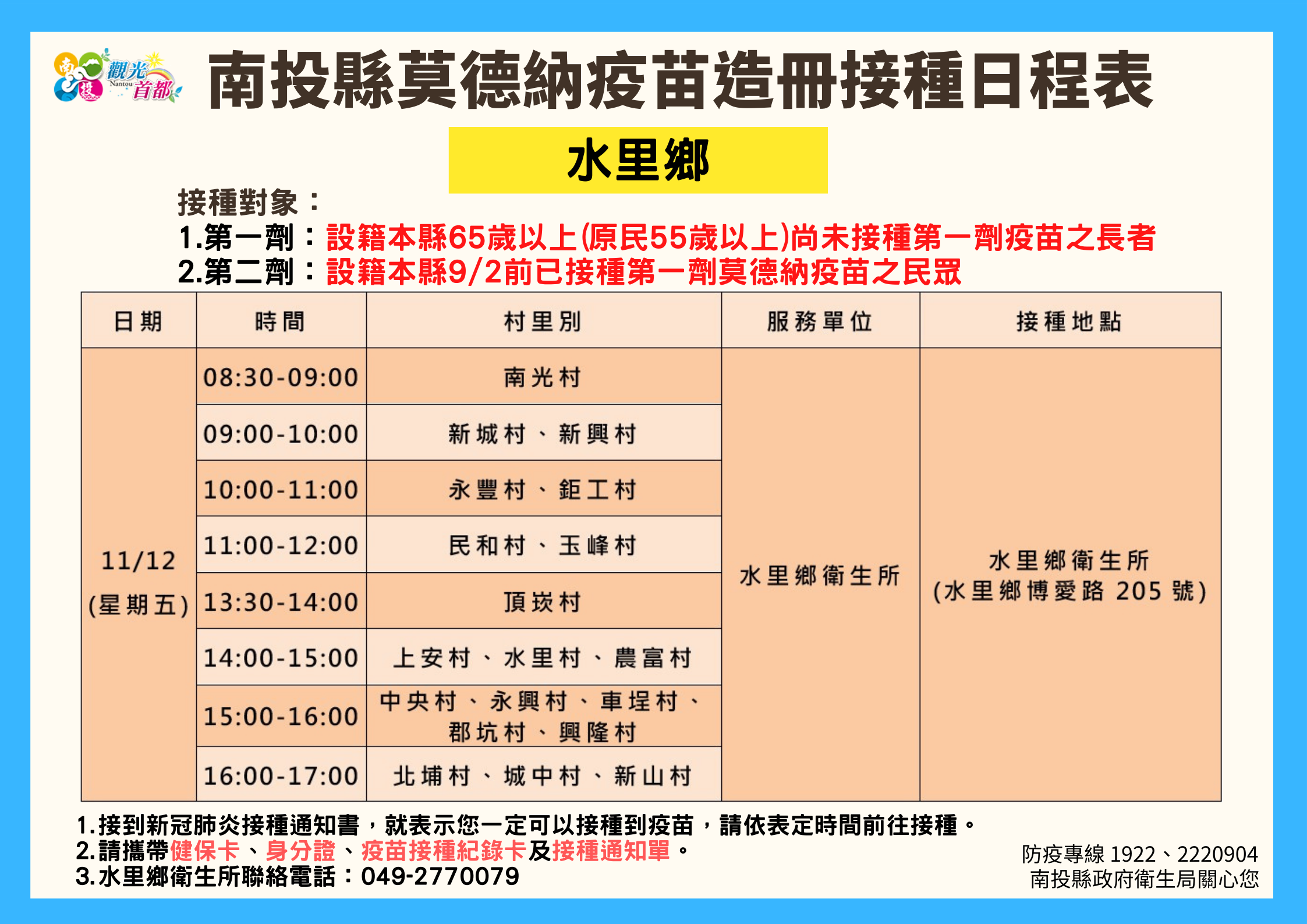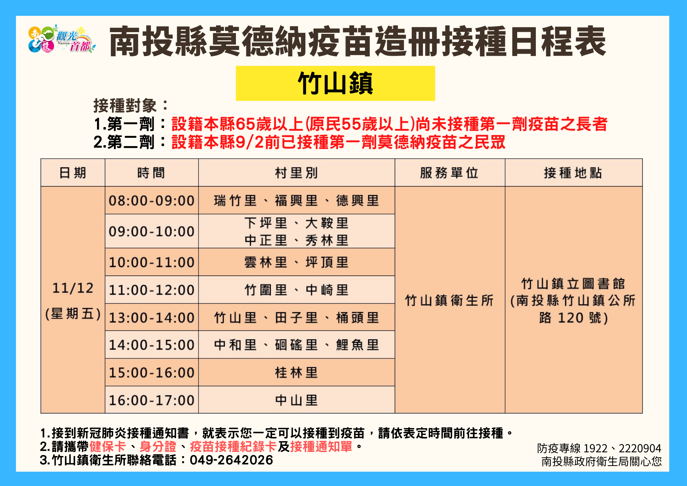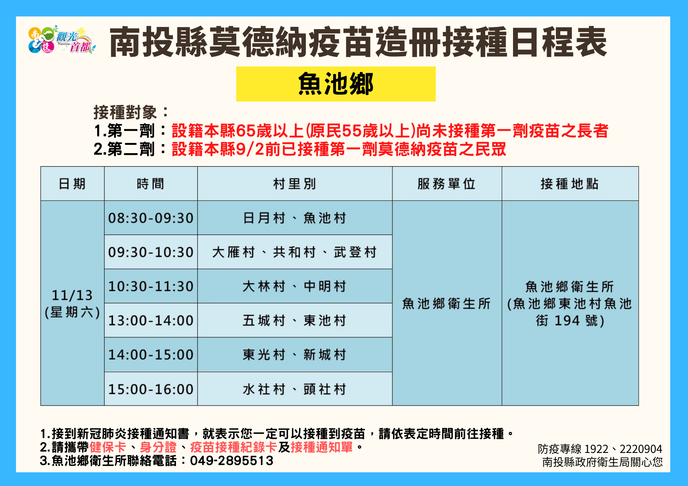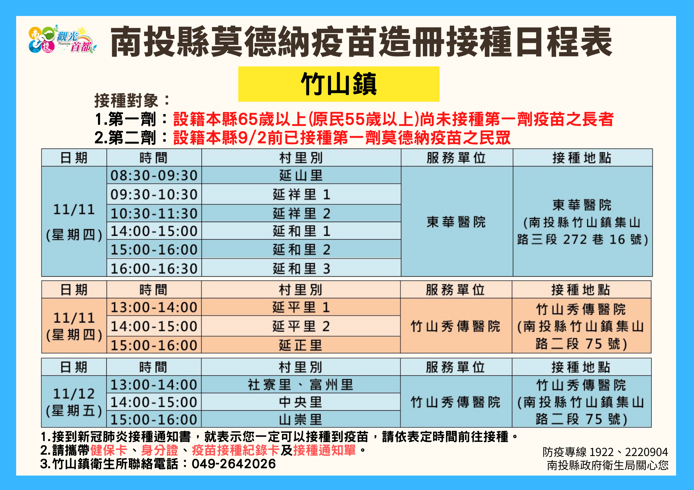 防疫宣傳 居家照護關懷手冊 防疫補助 勞工紓困 農漁畜牧 觀光紓困 企業紓困 租稅紓困 藝文紓困 中央各部會防疫專區 首頁 防疫宣傳 南投縣各鄉鎮市莫德納... 南投縣各鄉鎮市莫德納疫苗造冊接種日程表 公佈單位:新聞及行政處 發佈日期:110/11/10
