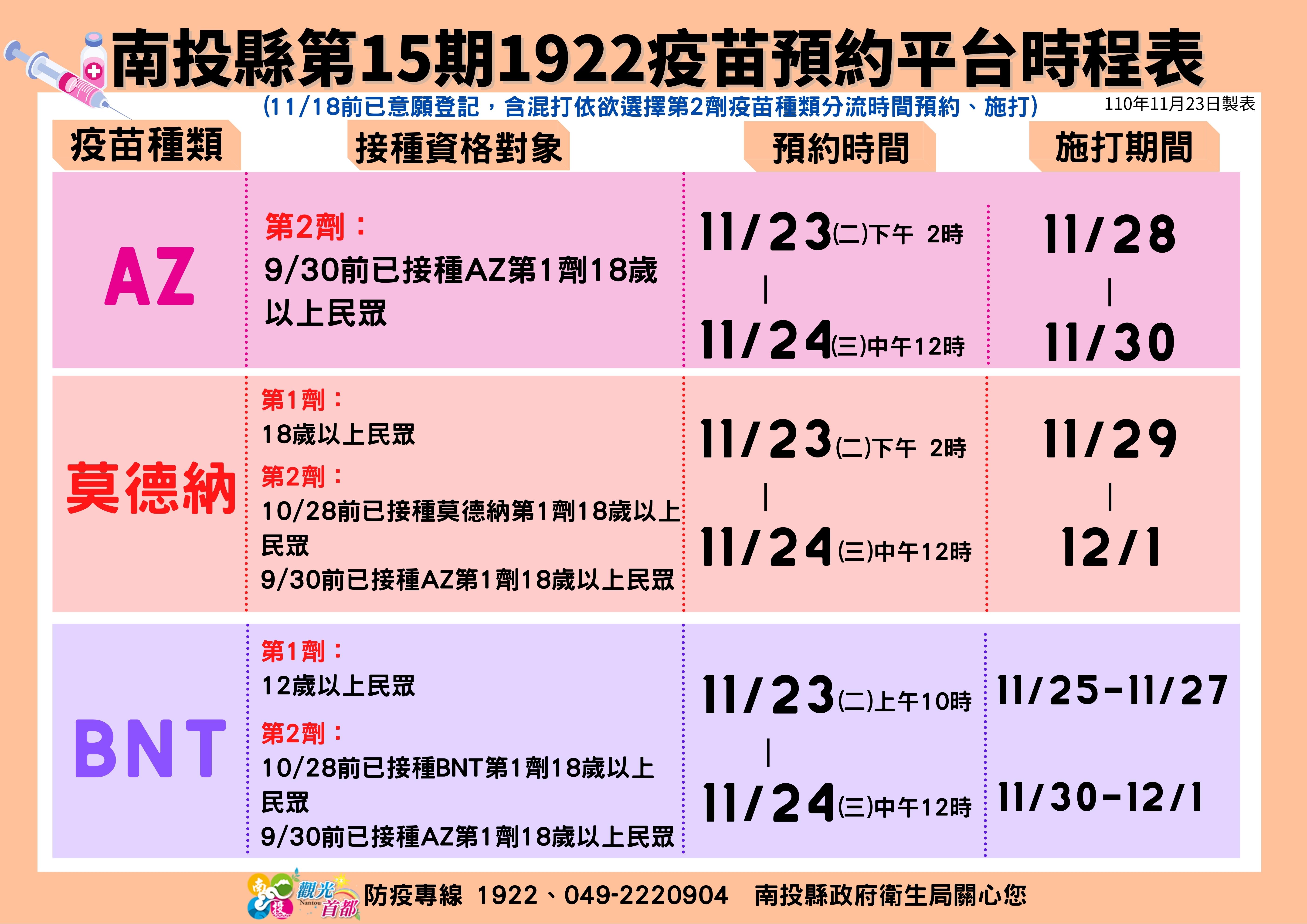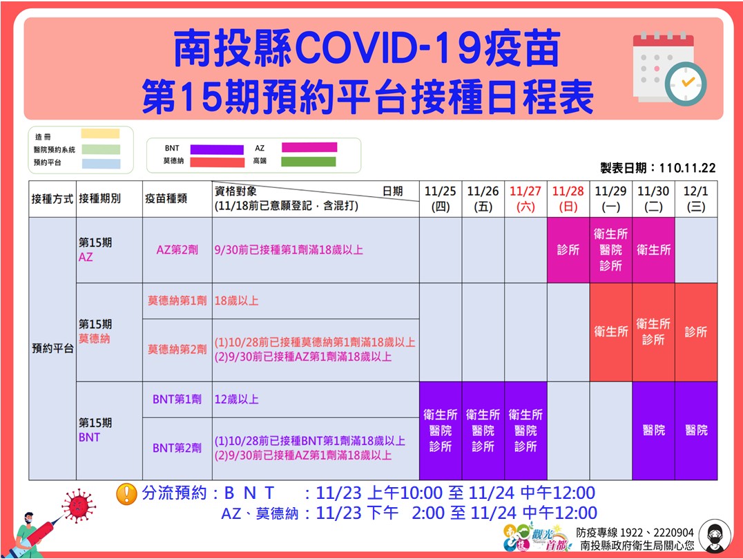 防疫宣傳 居家照護關懷手冊 防疫補助 勞工紓困 農漁畜牧 觀光紓困 企業紓困 租稅紓困 藝文紓困 中央各部會防疫專區 首頁 防疫宣傳 南投縣COVID-1... 南投縣COVID-19疫苗第15期預約平台接種日程表 公佈單位:新聞及行政處 發佈日期:110/11/24