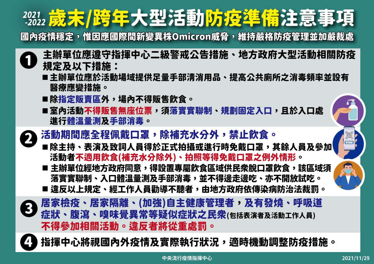 防疫宣傳 居家照護關懷手冊 防疫補助 勞工紓困 農漁畜牧 觀光紓困 企業紓困 租稅紓困 藝文紓困 中央各部會防疫專區 首頁 防疫宣傳 2021~2022歲... 2021~2022歲末/跨年大型活動防疫準備注意事項 公佈單位:新聞及行政處 發佈日期:110/11/29
