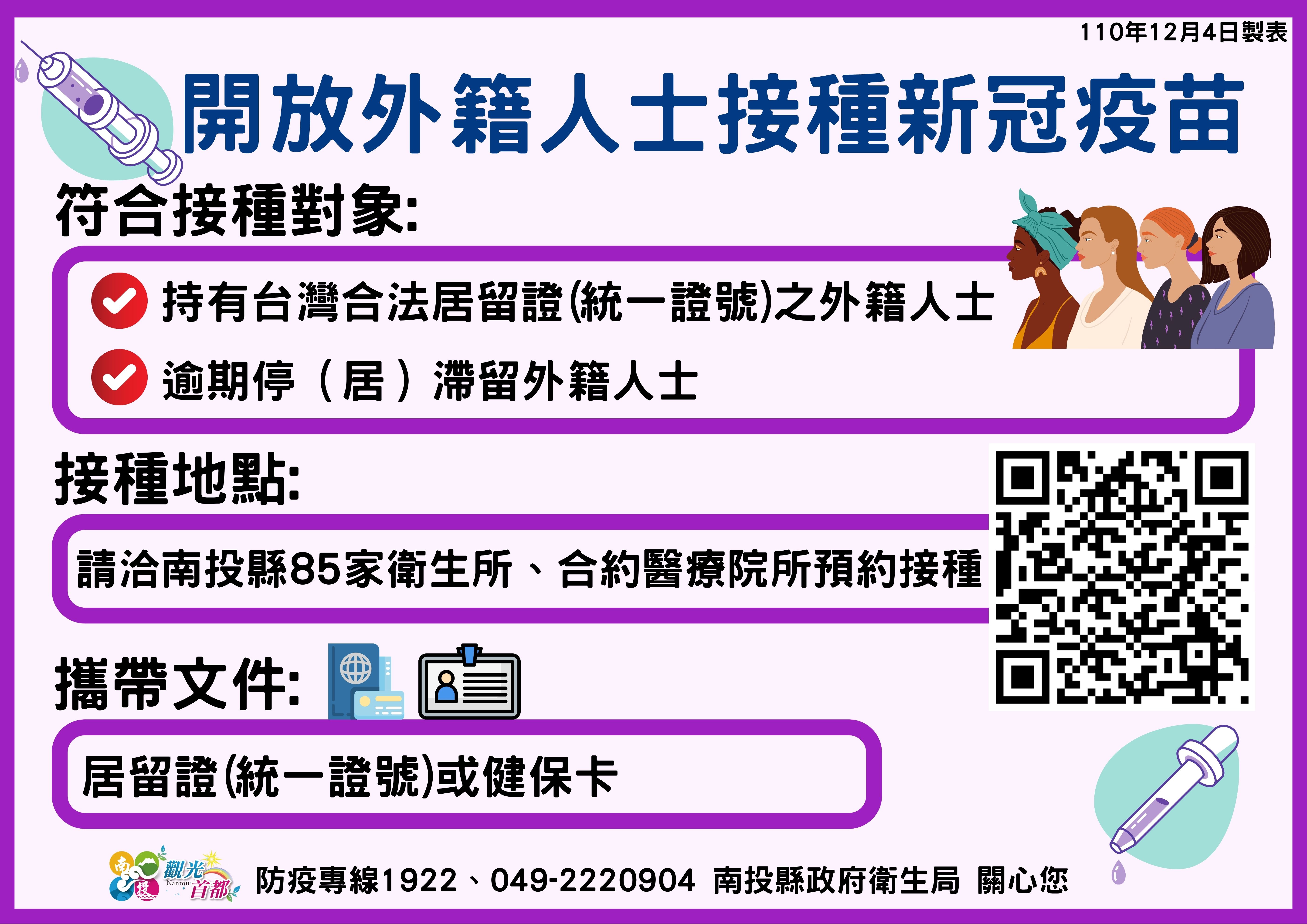 防疫宣傳 居家照護關懷手冊 防疫補助 勞工紓困 農漁畜牧 觀光紓困 企業紓困 租稅紓困 藝文紓困 中央各部會防疫專區 首頁 防疫宣傳 開放外籍人士接種疫苗 開放外籍人士接種疫苗 公佈單位:新聞及行政處 發佈日期:110/12/6