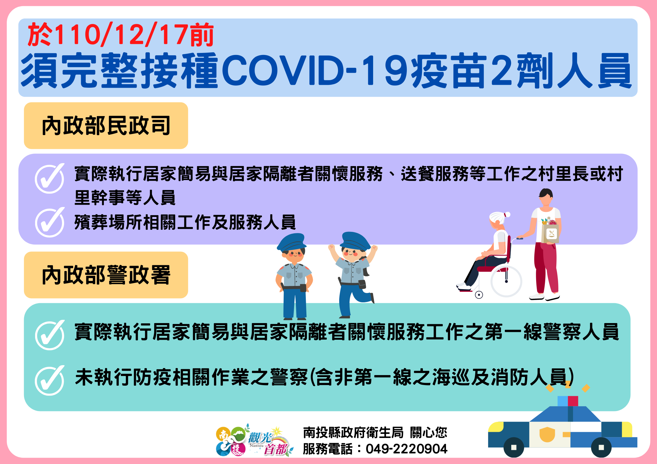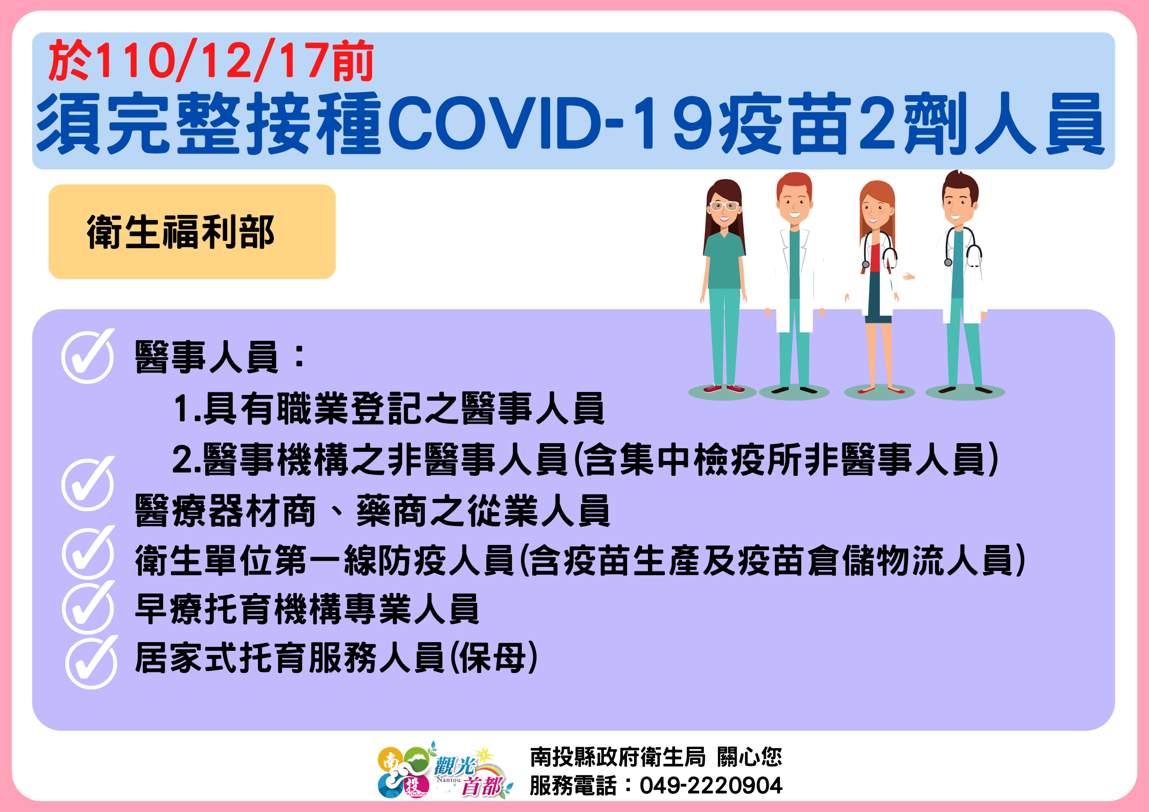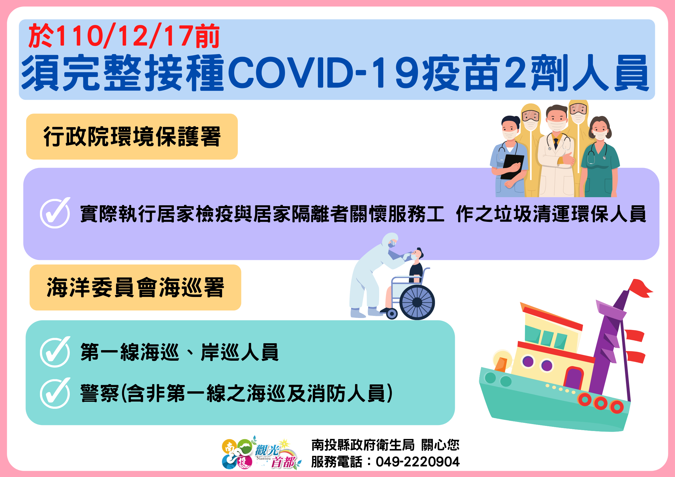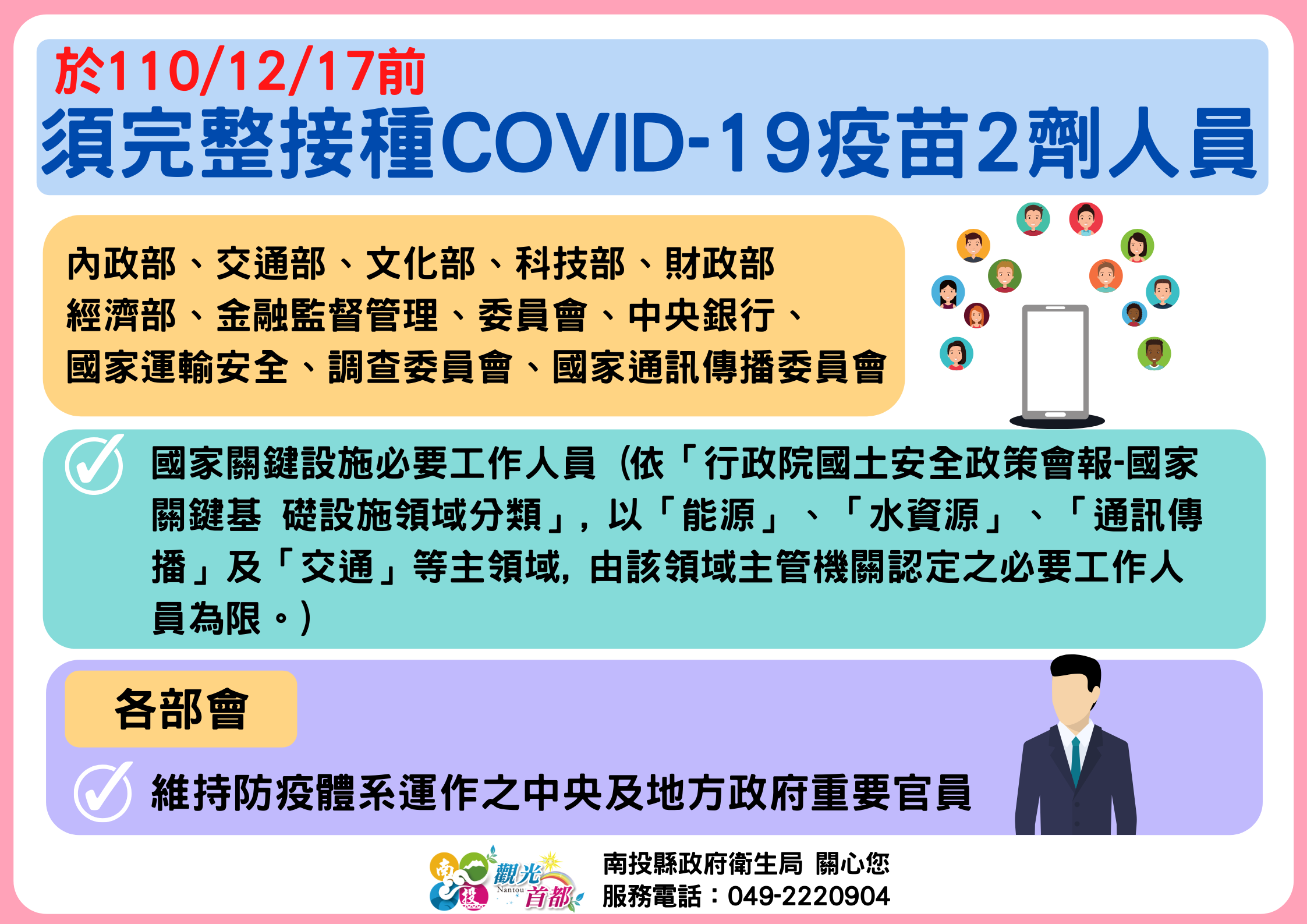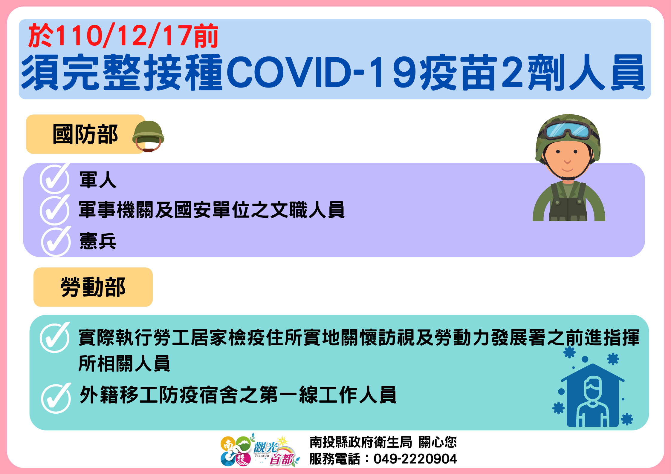 防疫宣傳 居家照護關懷手冊 防疫補助 勞工紓困 農漁畜牧 觀光紓困 企業紓困 租稅紓困 藝文紓困 中央各部會防疫專區 首頁 防疫宣傳 於110/12/17... 於110/12/17前須完整接種COVID-19疫苗2劑人員 公佈單位:新聞及行政處 發佈日期:110/12/13