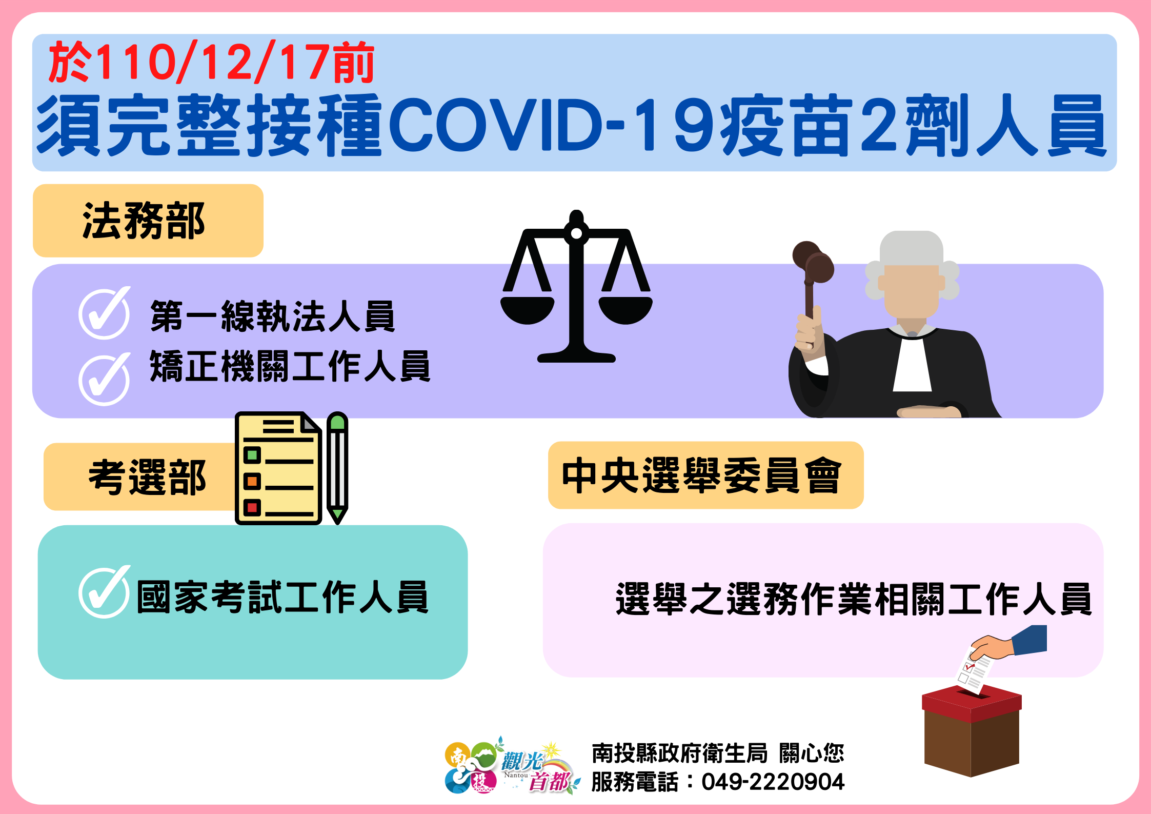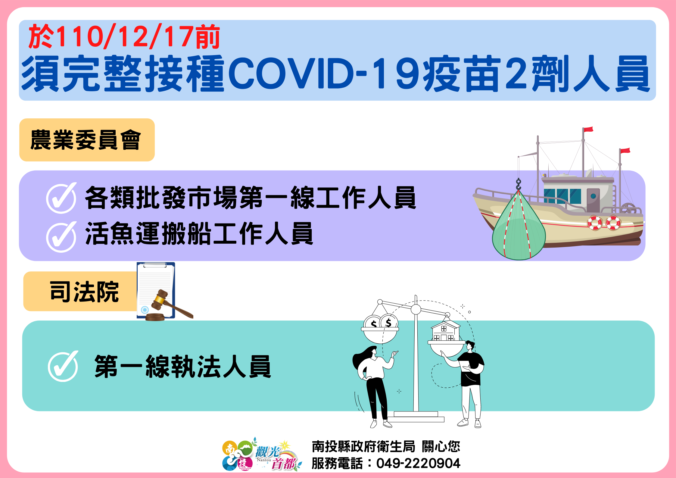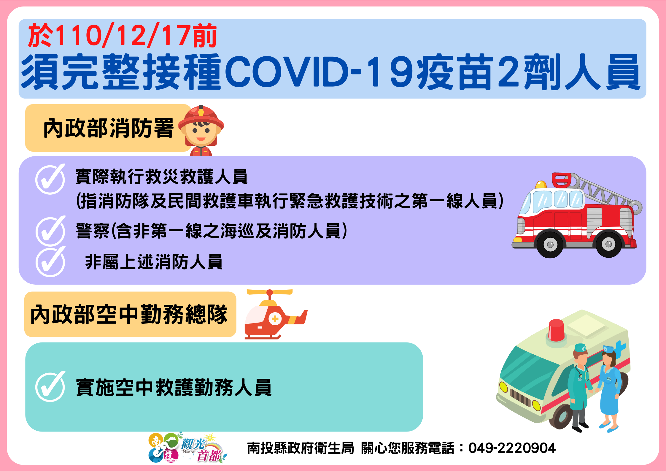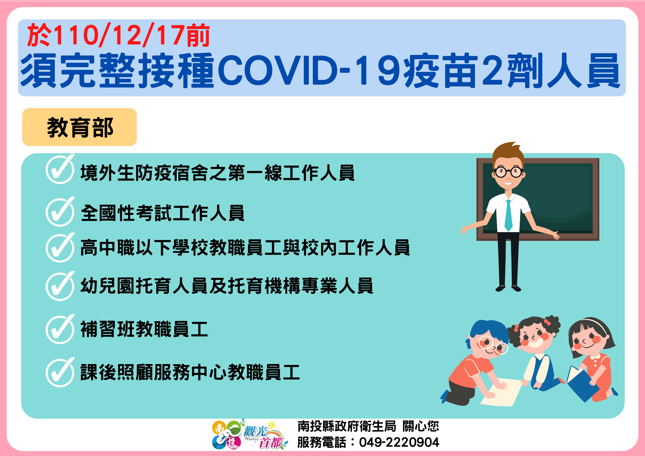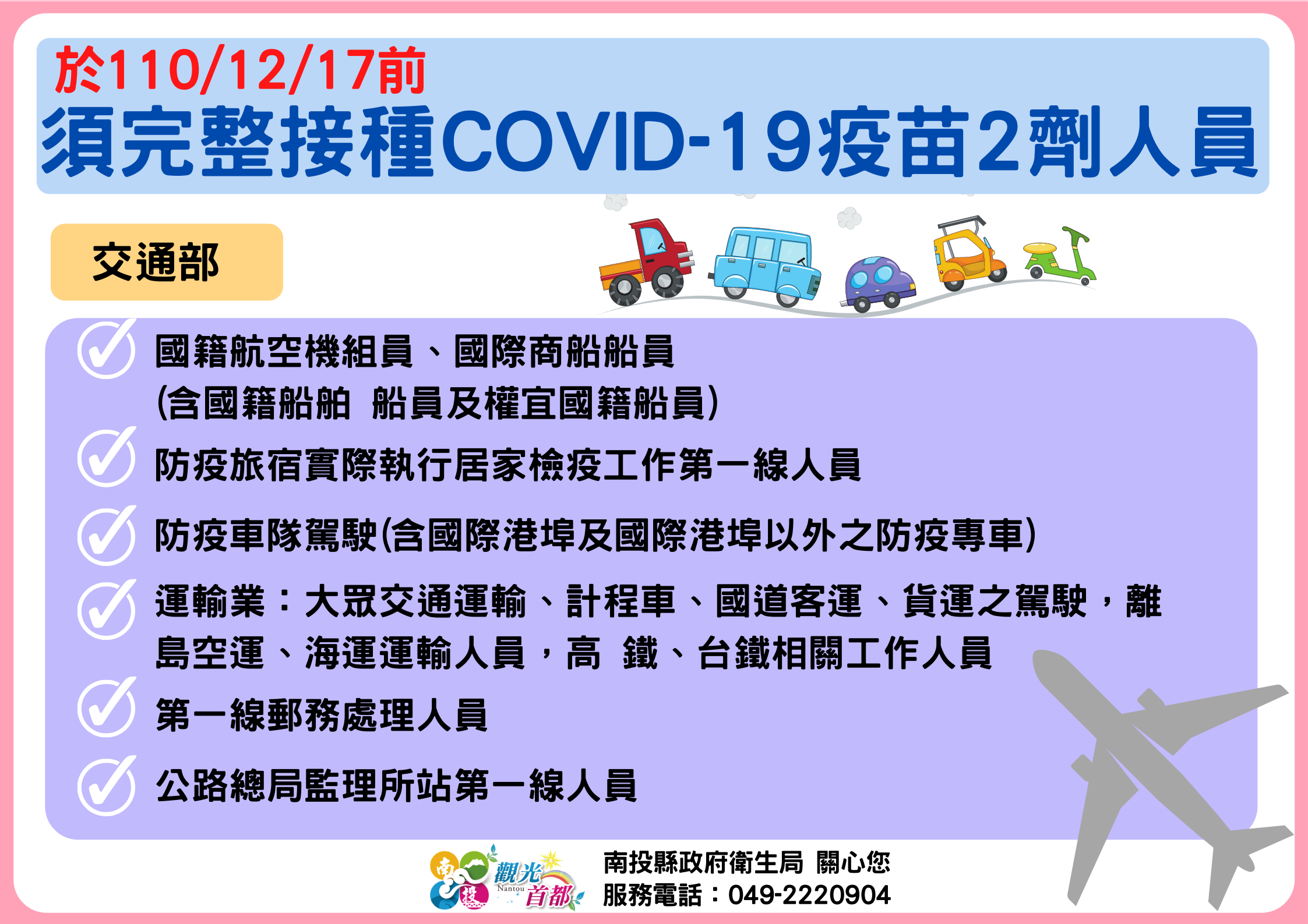防疫宣傳 居家照護關懷手冊 防疫補助 勞工紓困 農漁畜牧 觀光紓困 企業紓困 租稅紓困 藝文紓困 中央各部會防疫專區 首頁 防疫宣傳 於110/12/17... 於110/12/17前須完整接種COVID-19疫苗2劑人員 公佈單位:新聞及行政處 發佈日期:110/12/13