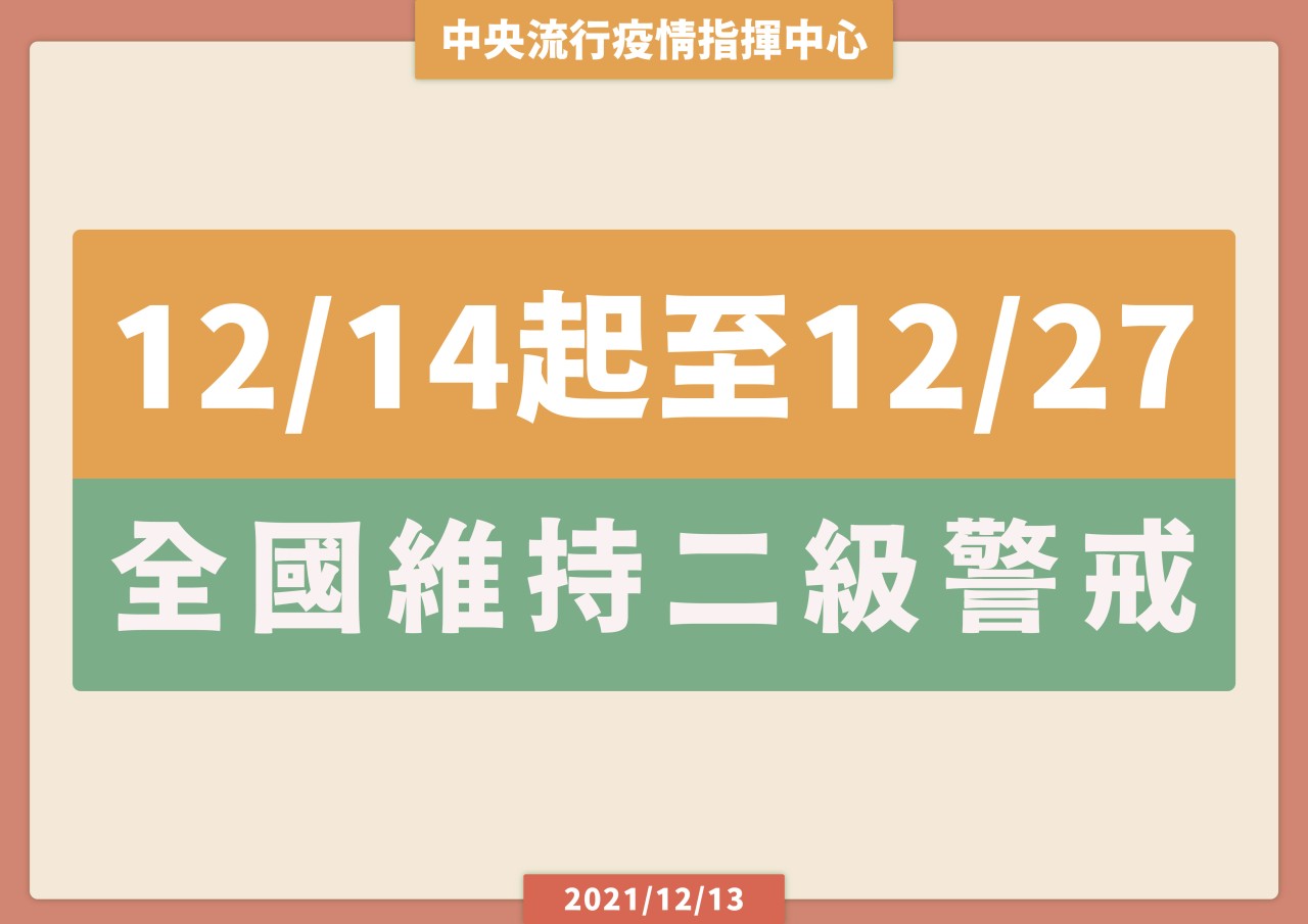 防疫宣傳 居家照護關懷手冊 防疫補助 勞工紓困 農漁畜牧 觀光紓困 企業紓困 租稅紓困 藝文紓困 中央各部會防疫專區 首頁 防疫宣傳 12/14起製12/... 12/14起製12/27全國維持二級警戒 公佈單位:新聞及行政處 發佈日期:110/12/14