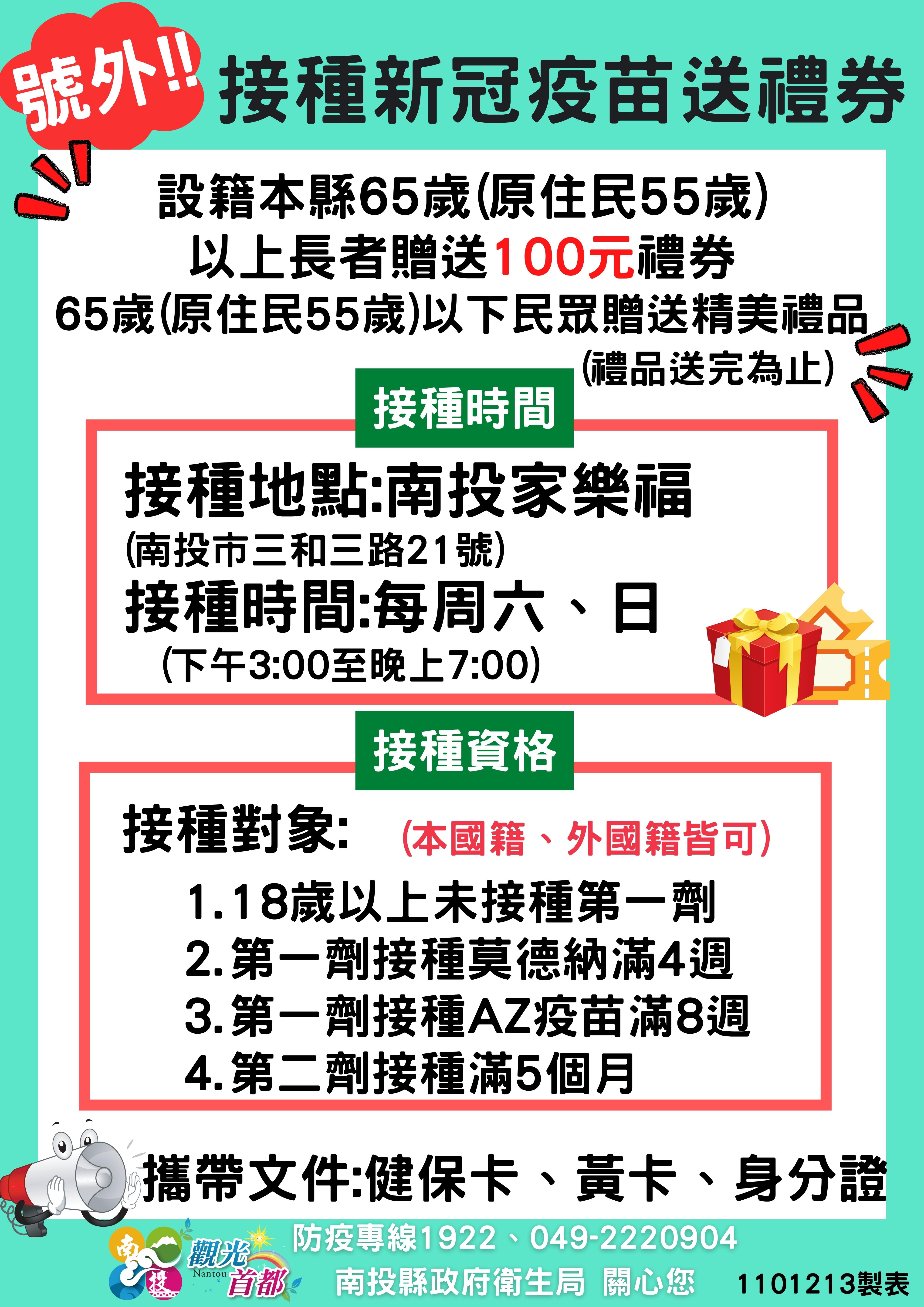 防疫宣傳 居家照護關懷手冊 防疫補助 勞工紓困 農漁畜牧 觀光紓困 企業紓困 租稅紓困 藝文紓困 中央各部會防疫專區 首頁 防疫宣傳 接種疫苗送禮卷 接種疫苗送禮卷 公佈單位:新聞及行政處 發佈日期:110/12/17