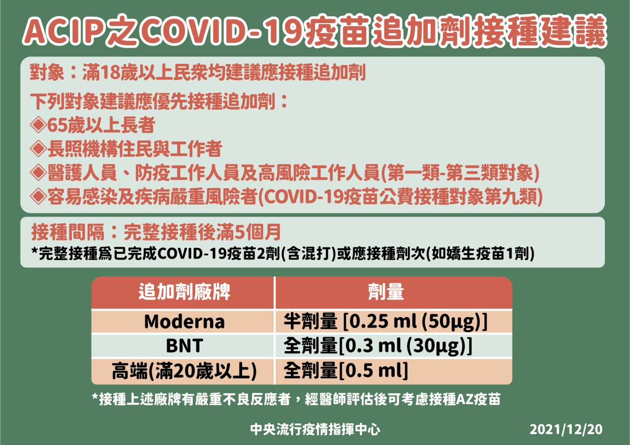 防疫宣傳 居家照護關懷手冊 防疫補助 勞工紓困 農漁畜牧 觀光紓困 企業紓困 租稅紓困 藝文紓困 中央各部會防疫專區 首頁 防疫宣傳 ACIP之COVID... ACIP之COVID-19疫苗追加價接種建議 公佈單位:新聞及行政處 發佈日期:110/12/21