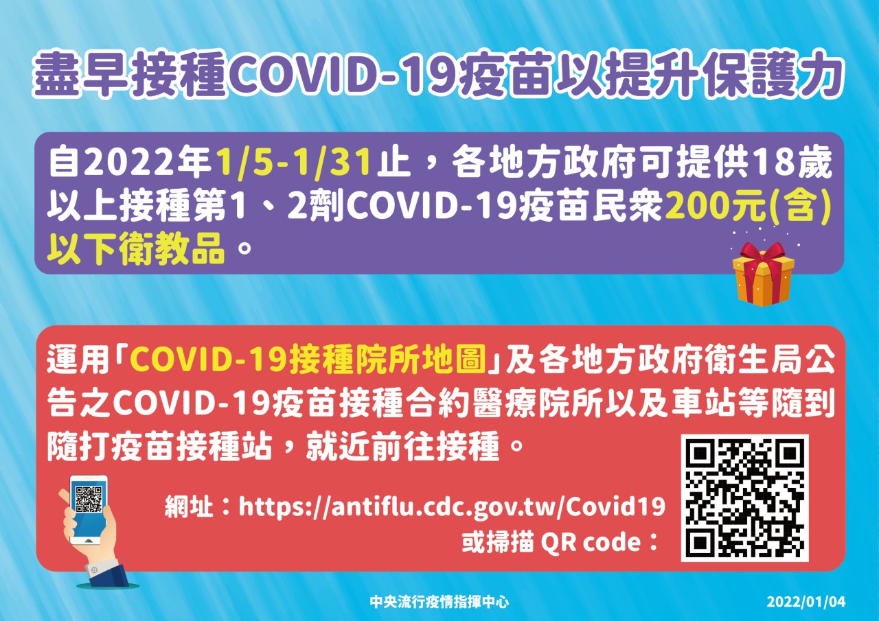 防疫宣傳 居家照護關懷手冊 防疫補助 勞工紓困 農漁畜牧 觀光紓困 企業紓困 租稅紓困 藝文紓困 中央各部會防疫專區 首頁 防疫宣傳 盡早接種COVID-... 盡早接種COVID-19疫苗以提升保護力 公佈單位:新聞及行政處 發佈日期:111/1/4