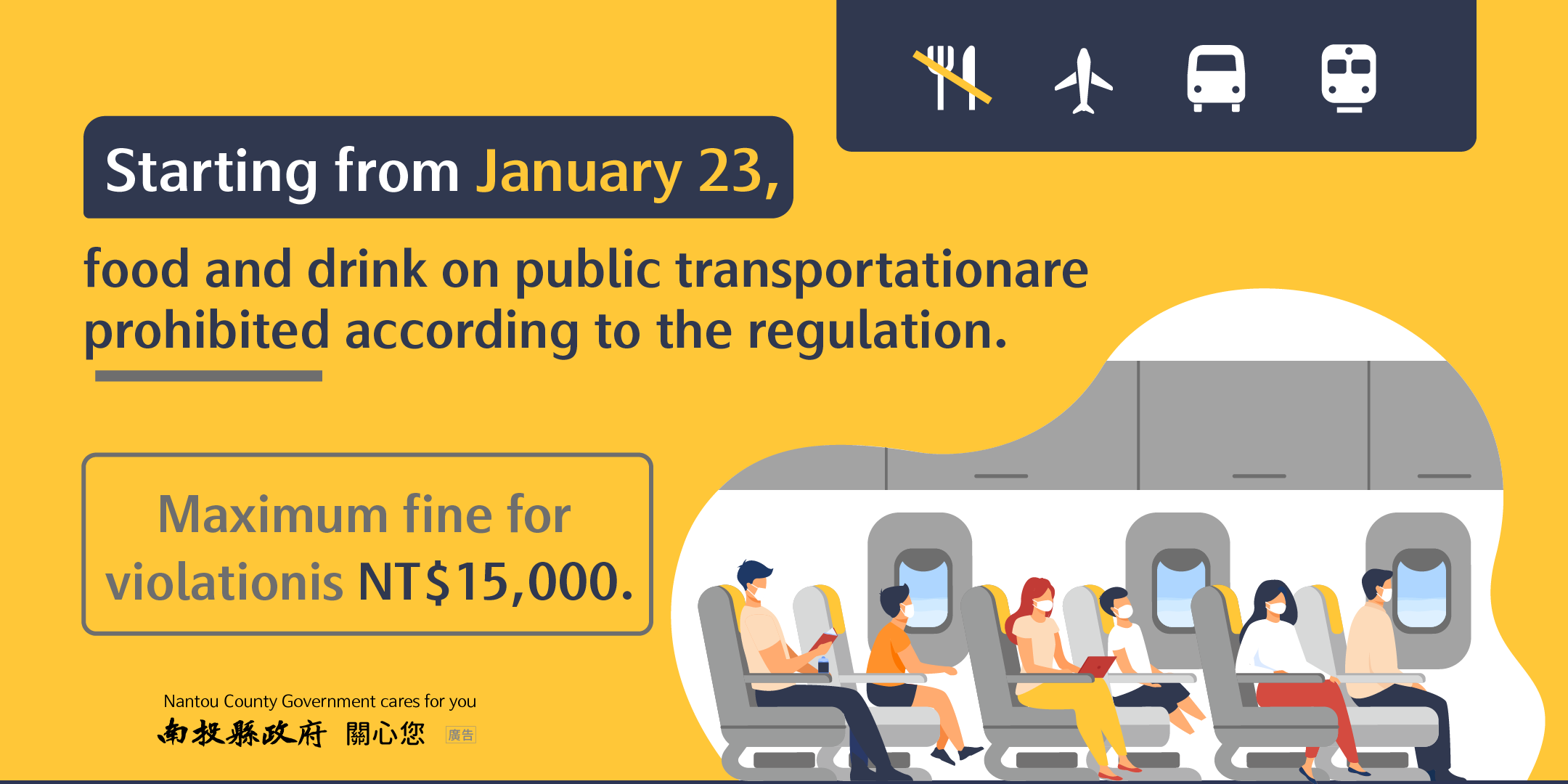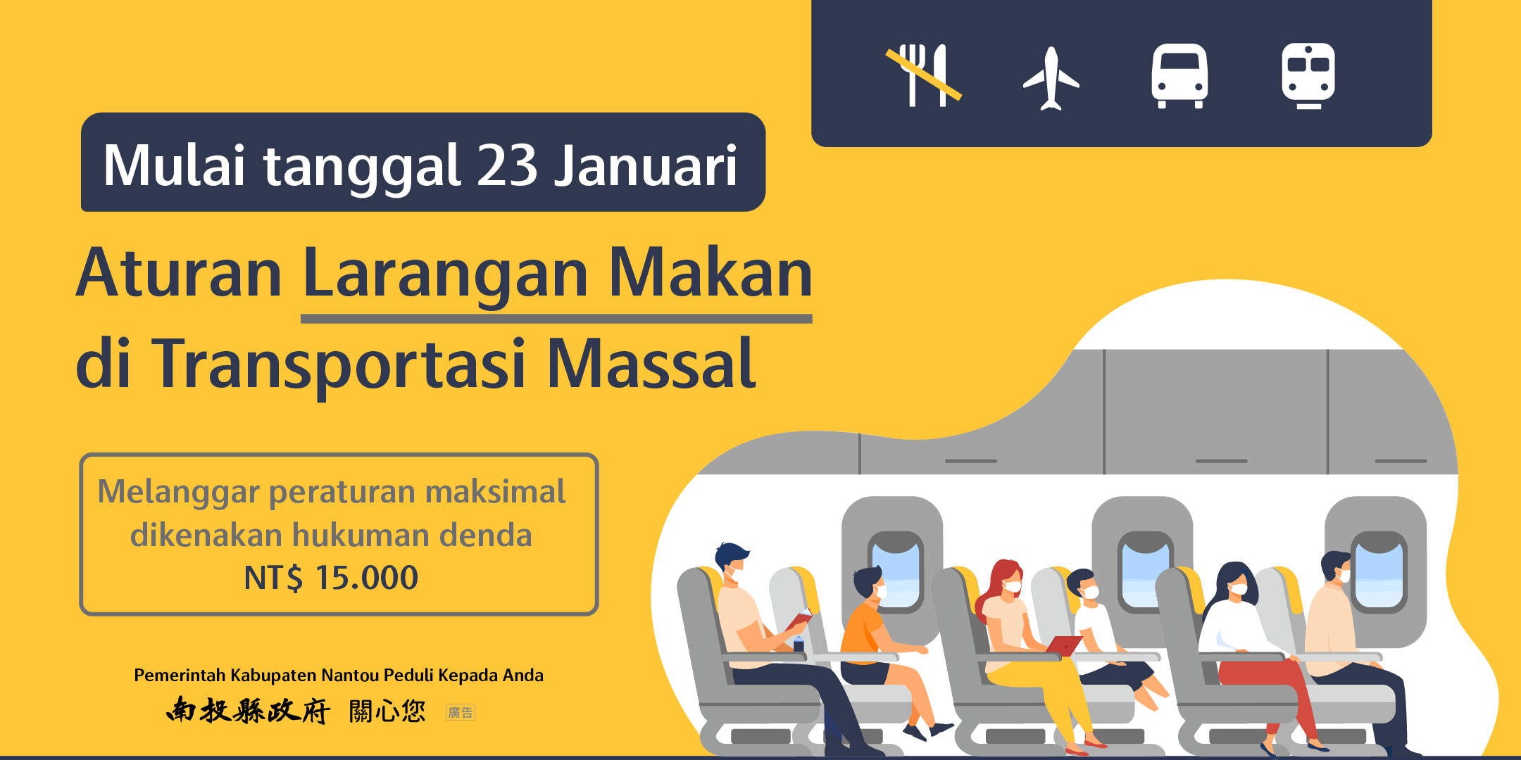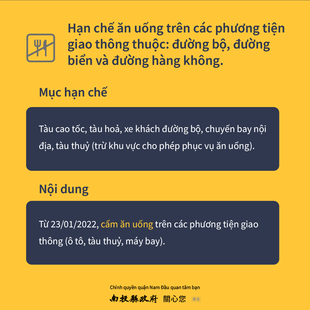 防疫宣傳 居家照護關懷手冊 防疫補助 勞工紓困 農漁畜牧 觀光紓困 企業紓困 租稅紓困 藝文紓困 中央各部會防疫專區 首頁 防疫宣傳 1110123起大眾... 1110123起大眾運輸禁食規範(英文版、越語版、印尼語版) 公佈單位:新聞及行政處 發佈日期:111/1/28