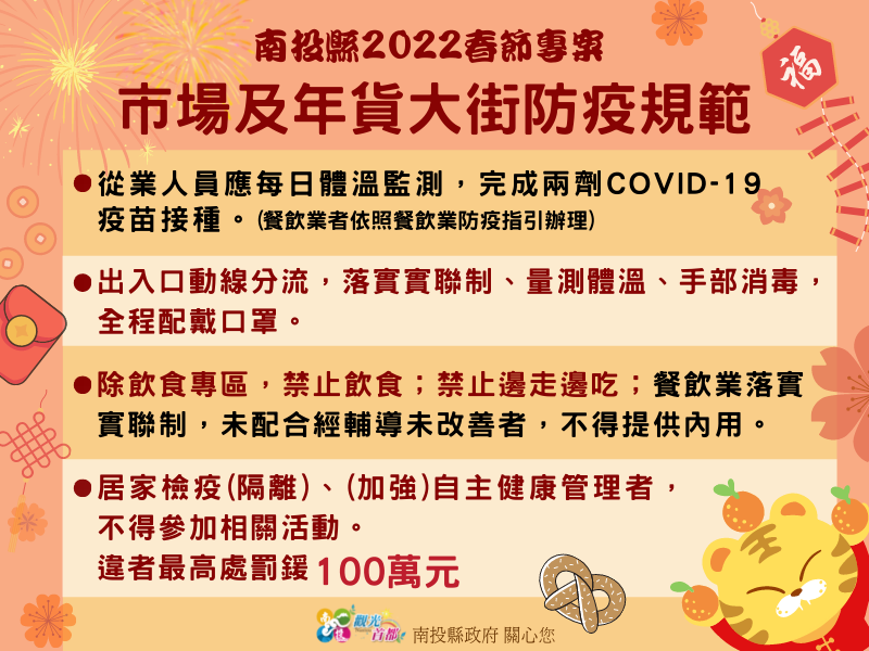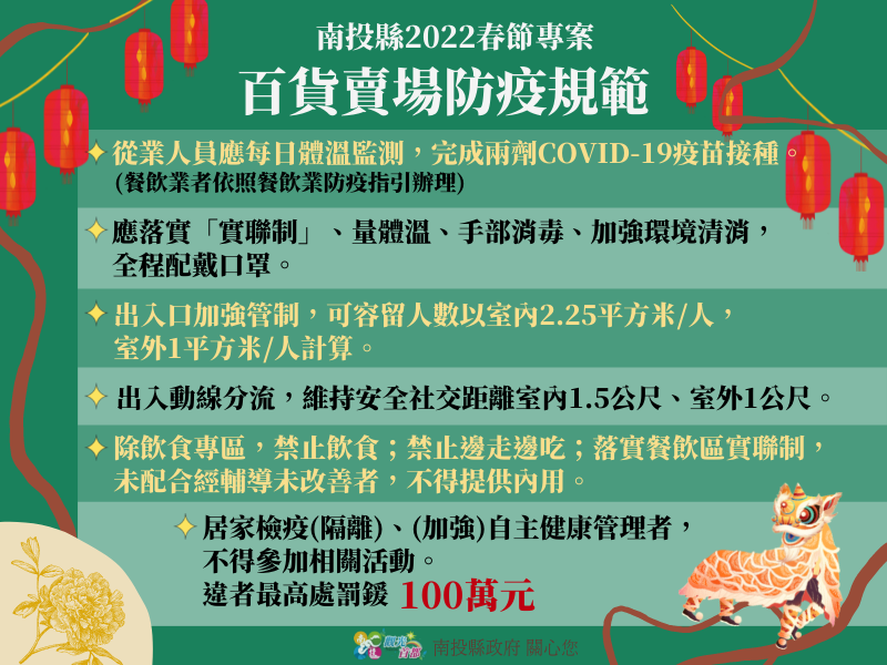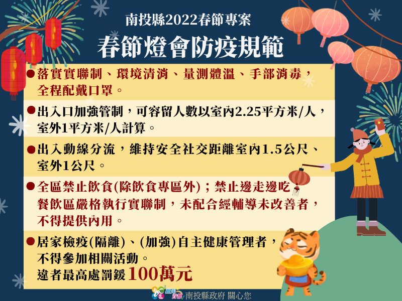 防疫宣傳 居家照護關懷手冊 防疫補助 勞工紓困 農漁畜牧 觀光紓困 企業紓困 租稅紓困 藝文紓困 中央各部會防疫專區 首頁 防疫宣傳 春節防疫規範(燈會&... 春節防疫規範(燈會、廟宇、百貨、市場及年貨大街) 公佈單位:新聞及行政處 發佈日期:111/1/31