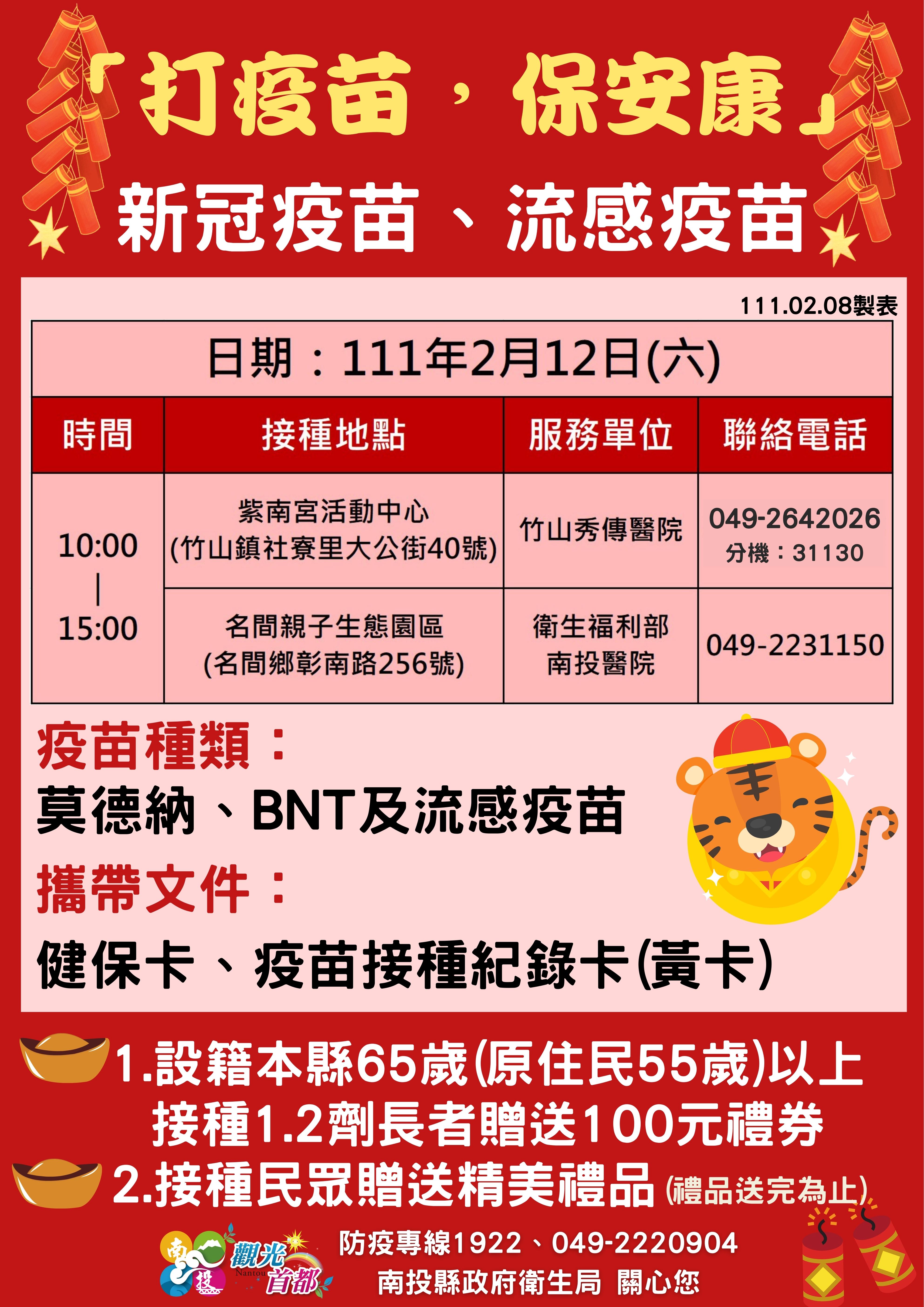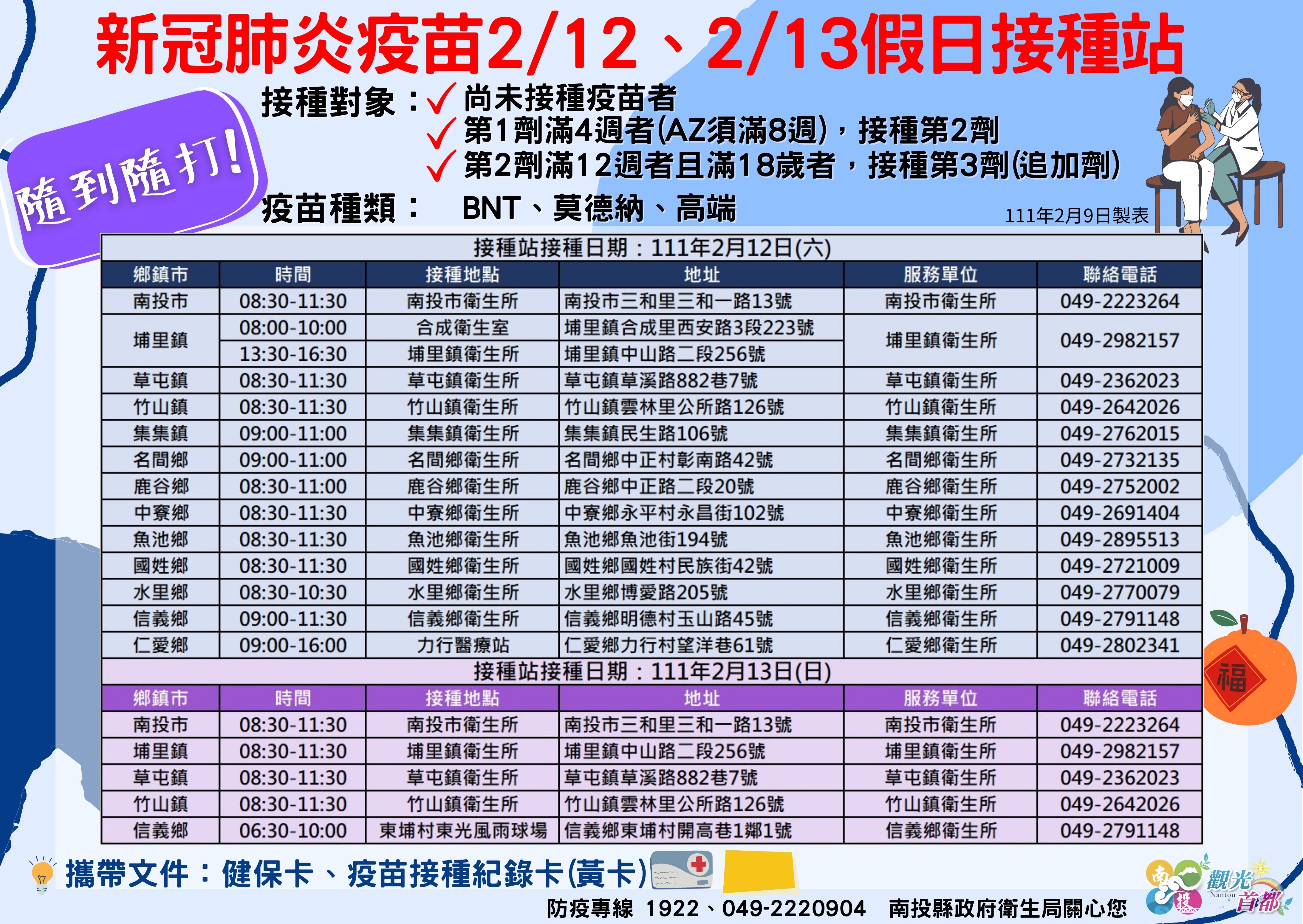 防疫宣傳 居家照護關懷手冊 防疫補助 勞工紓困 農漁畜牧 觀光紓困 企業紓困 租稅紓困 藝文紓困 中央各部會防疫專區 首頁 防疫宣傳 新冠肺炎疫苗2/12... 新冠肺炎疫苗2/12、2/13假日接種站 公佈單位:新聞及行政處 發佈日期:111/2/9