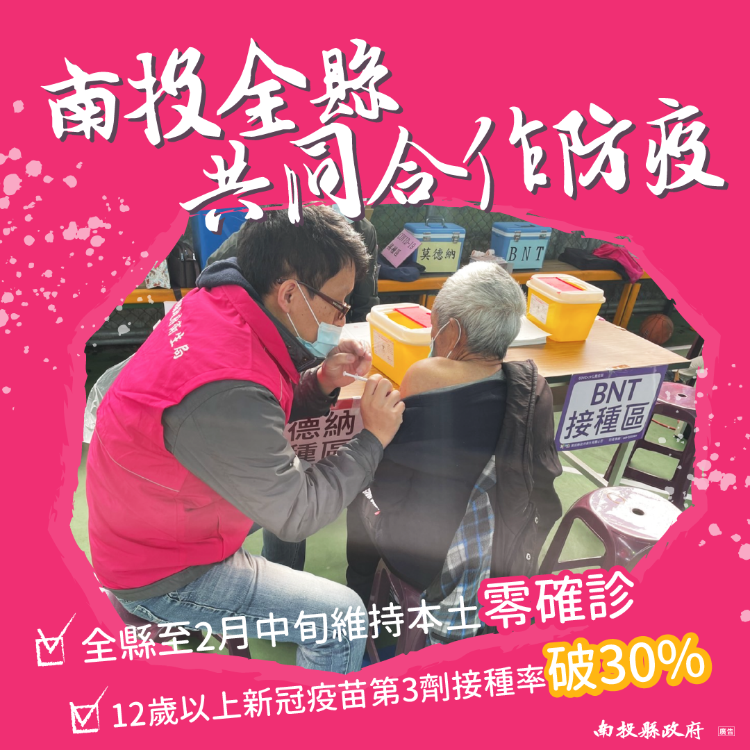 防疫宣傳 居家照護關懷手冊 防疫補助 勞工紓困 農漁畜牧 觀光紓困 企業紓困 租稅紓困 藝文紓困 中央各部會防疫專區 首頁 防疫宣傳 南投全縣共同合作防疫 南投全縣共同合作防疫 公佈單位:新聞及行政處 發佈日期:111/2/18