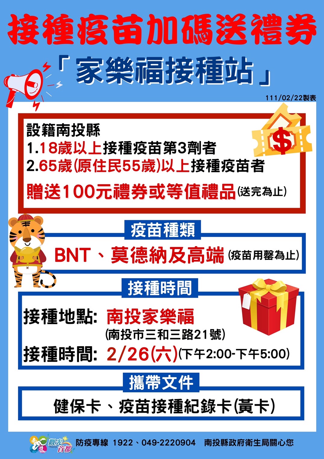 防疫宣傳 居家照護關懷手冊 防疫補助 勞工紓困 農漁畜牧 觀光紓困 企業紓困 租稅紓困 藝文紓困 中央各部會防疫專區 首頁 防疫宣傳 接種疫苗加碼送禮券 ... 接種疫苗加碼送禮券 「家樂福接種站」 公佈單位:新聞及行政處 發佈日期:111/2/24