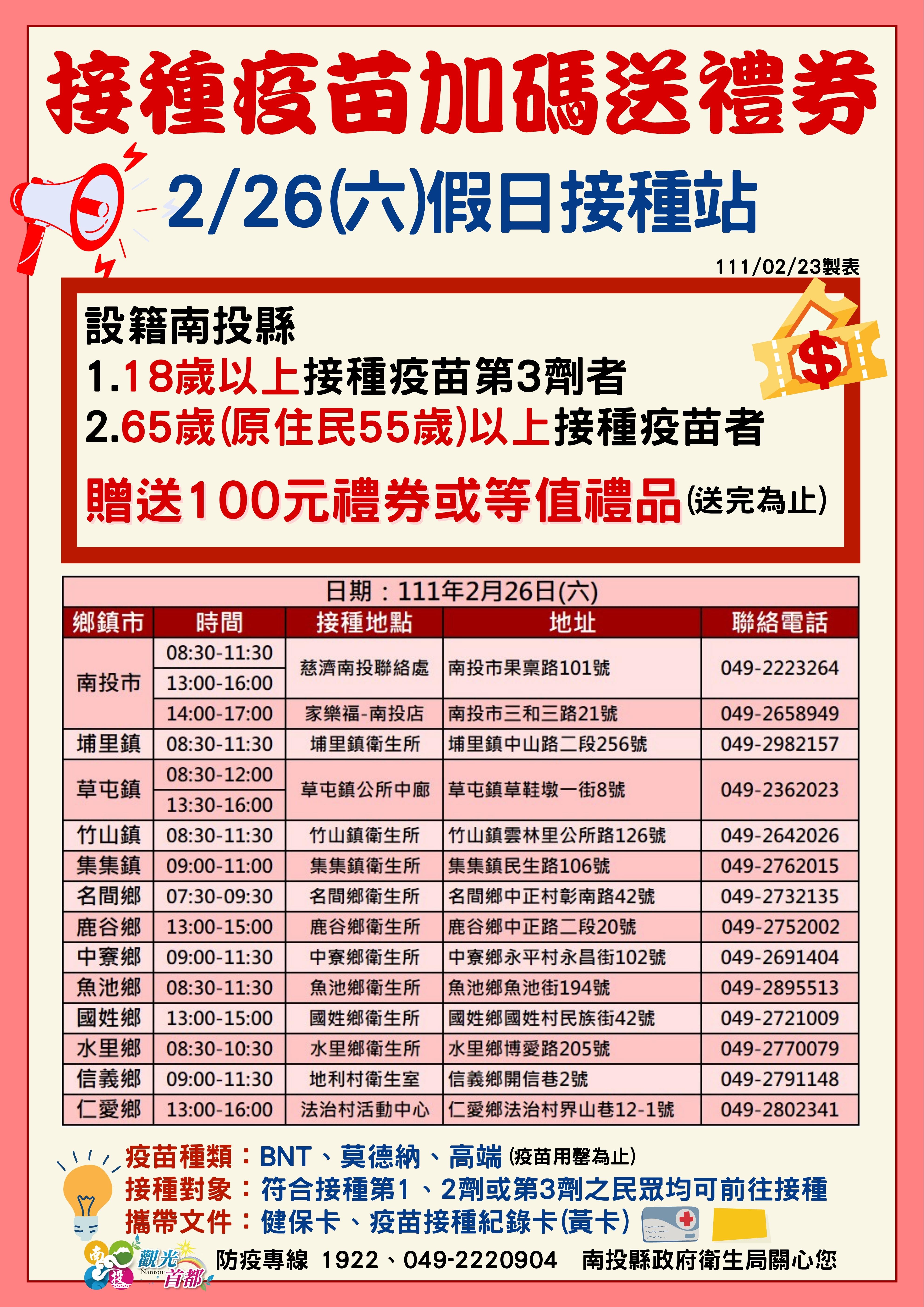 防疫宣傳 居家照護關懷手冊 防疫補助 勞工紓困 農漁畜牧 觀光紓困 企業紓困 租稅紓困 藝文紓困 中央各部會防疫專區 首頁 防疫宣傳 接種疫苗加碼送禮券 ... 接種疫苗加碼送禮券 2/26(六)假日接種站 公佈單位:新聞及行政處 發佈日期:111/2/24