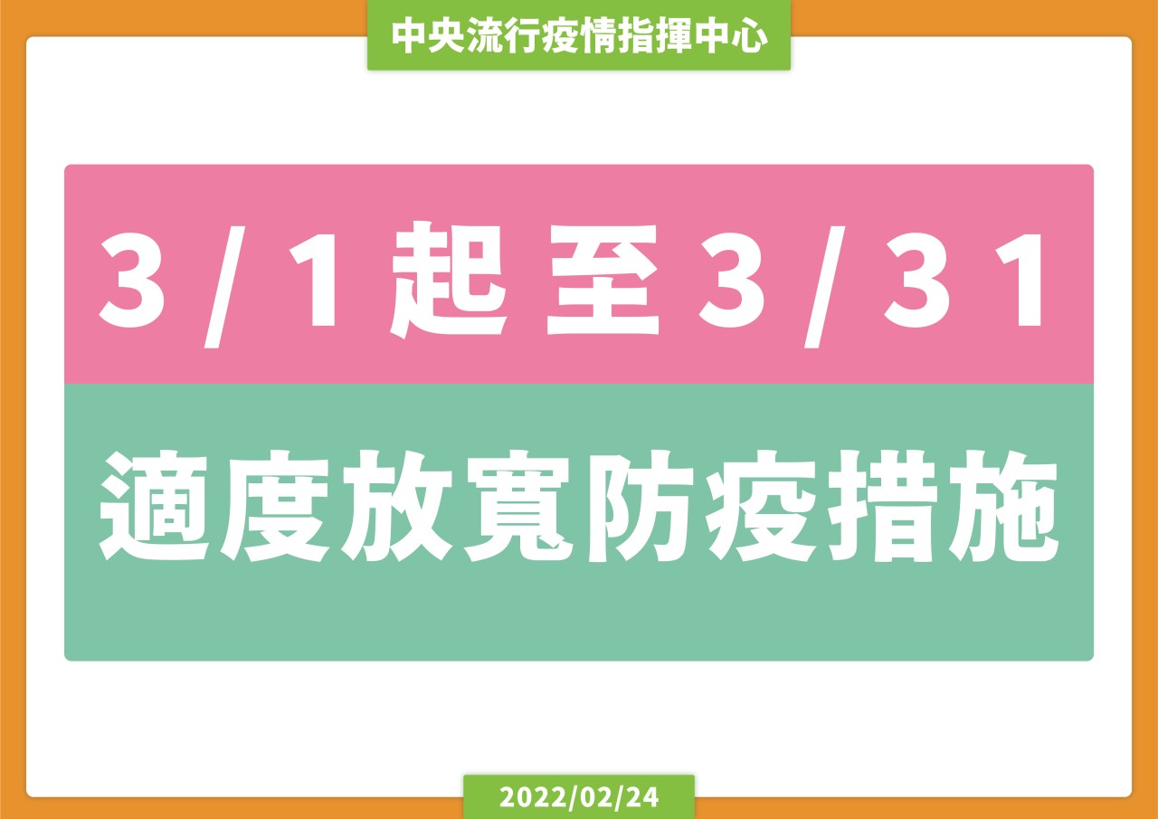 防疫宣傳 居家照護關懷手冊 防疫補助 勞工紓困 農漁畜牧 觀光紓困 企業紓困 租稅紓困 藝文紓困 中央各部會防疫專區 首頁 防疫宣傳 3/1起至3/31適... 3/1起至3/31適度放寬防疫措施 公佈單位:新聞及行政處 發佈日期:111/2/25