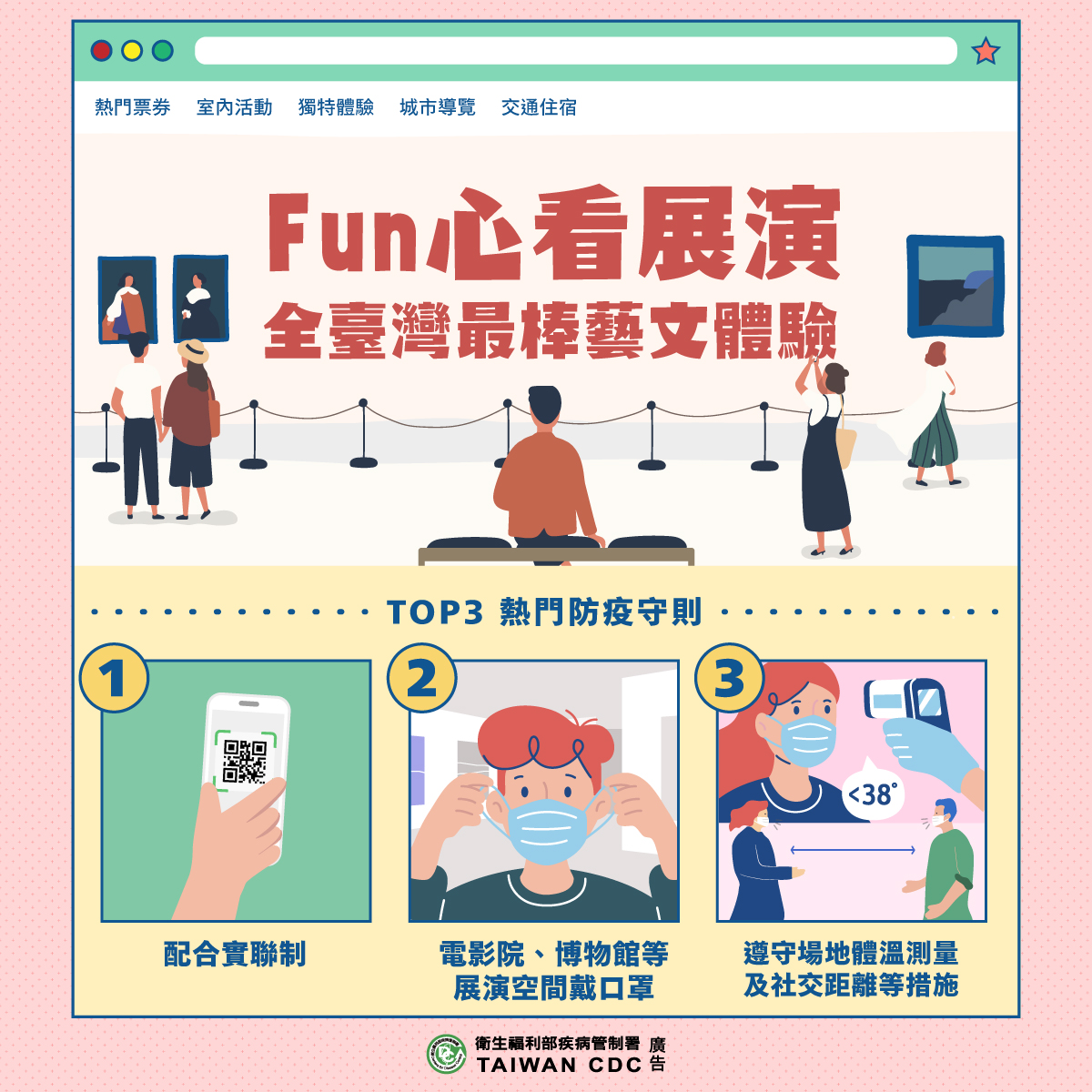 防疫宣傳 居家照護關懷手冊 防疫補助 勞工紓困 農漁畜牧 觀光紓困 企業紓困 租稅紓困 藝文紓困 中央各部會防疫專區 首頁 防疫宣傳 Fun心看展演 全台... Fun心看展演 全台灣最棒藝文體驗 公佈單位:新聞及行政處 發佈日期:111/2/25