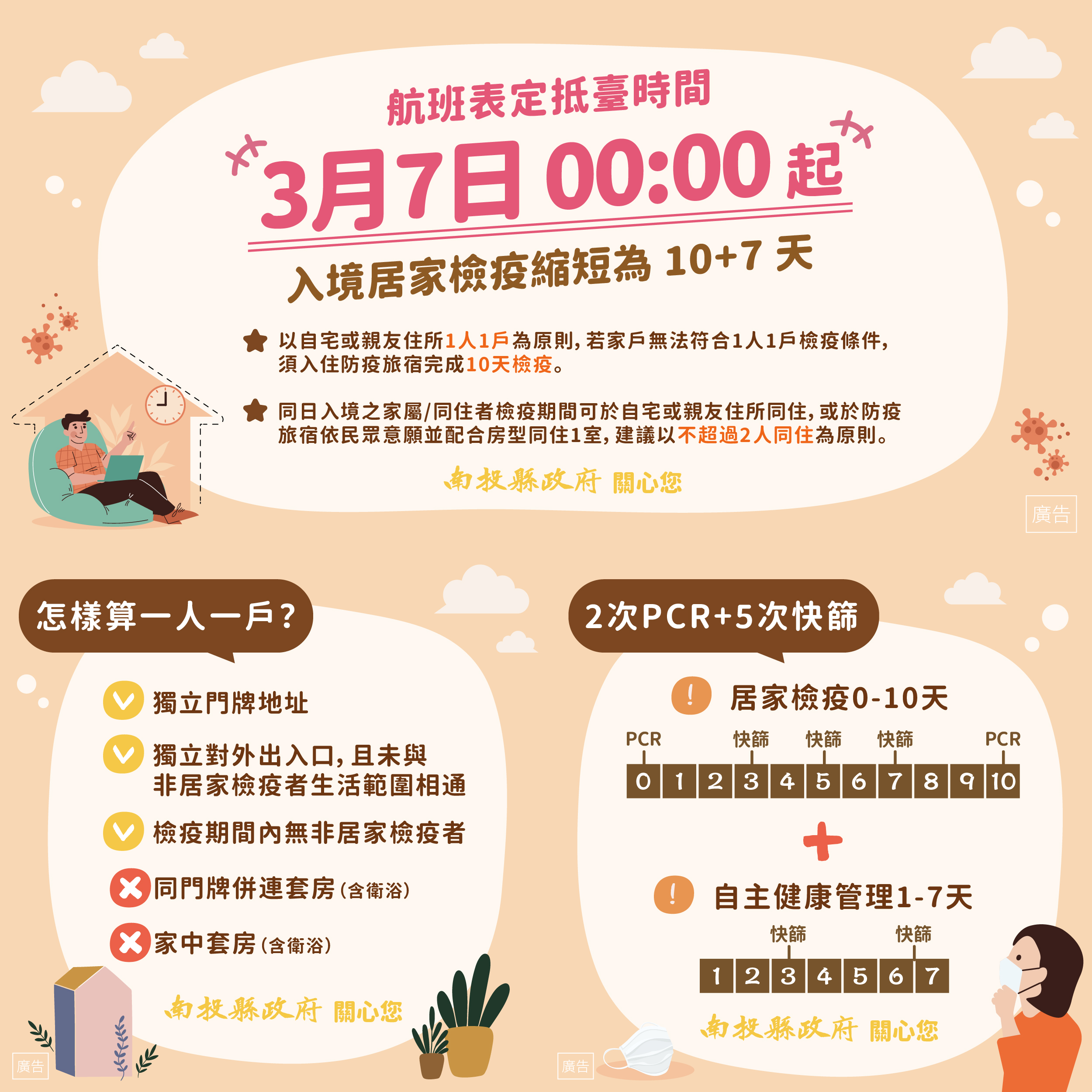 防疫宣傳 居家照護關懷手冊 防疫補助 勞工紓困 農漁畜牧 觀光紓困 企業紓困 租稅紓困 藝文紓困 中央各部會防疫專區 首頁 防疫宣傳 3月7日00:00起... 3月7日00:00起入境居家檢疫縮短為10+7天 公佈單位:新聞及行政處 發佈日期:111/3/2