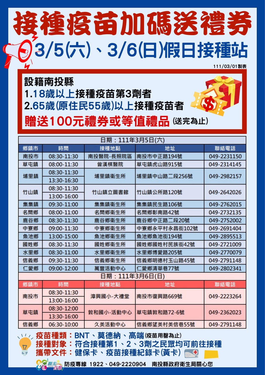 防疫宣傳 居家照護關懷手冊 防疫補助 勞工紓困 農漁畜牧 觀光紓困 企業紓困 租稅紓困 藝文紓困 中央各部會防疫專區 首頁 防疫宣傳 接種疫苗加碼送禮券 ... 接種疫苗加碼送禮券 3/5(六)、3/6 (日)假日接種站 公佈單位:新聞及行政處 發佈日期:111/3/4