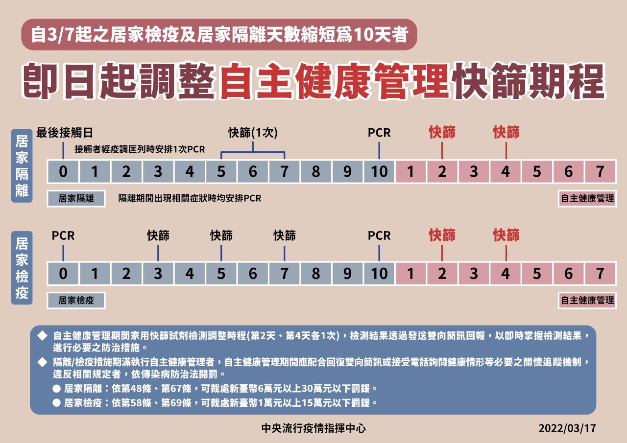 防疫宣傳 居家照護關懷手冊 防疫補助 勞工紓困 農漁畜牧 觀光紓困 企業紓困 租稅紓困 藝文紓困 中央各部會防疫專區 首頁 防疫宣傳 即日起調整自主健康管... 即日起調整自主健康管理快篩期程 公佈單位:新聞及行政處 發佈日期:111/3/17