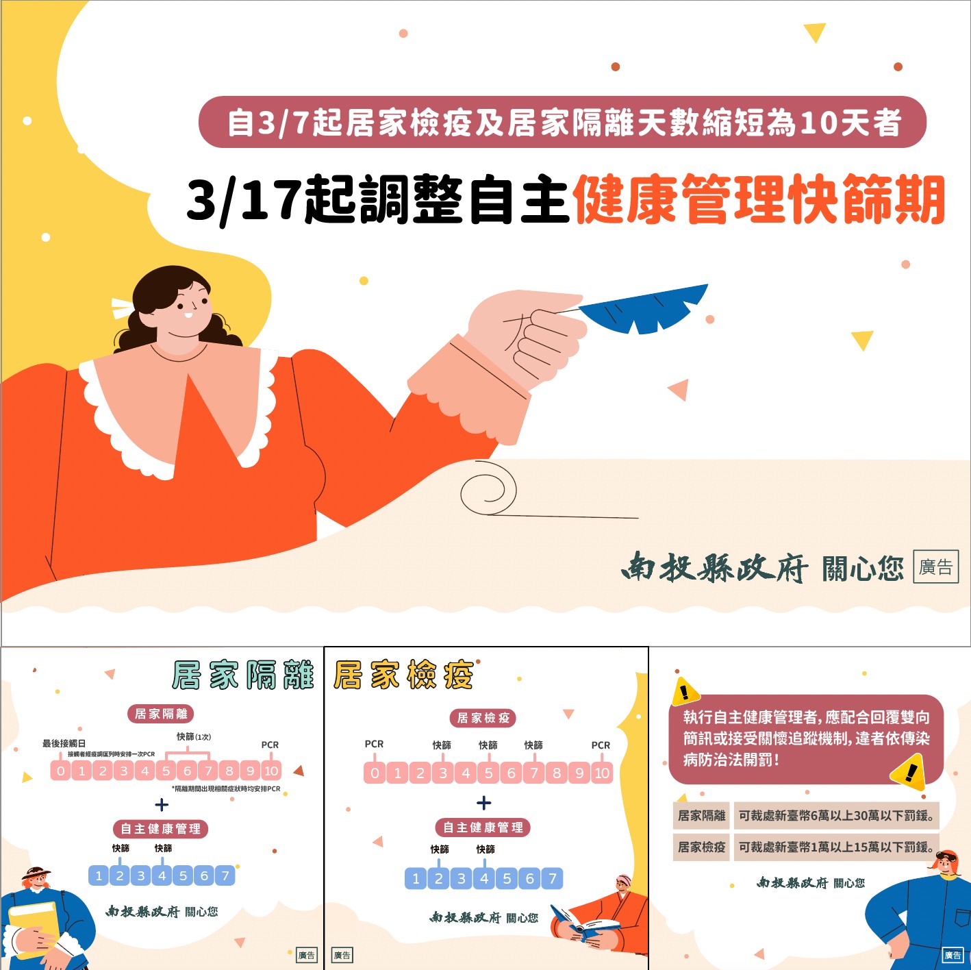防疫宣傳 居家照護關懷手冊 防疫補助 勞工紓困 農漁畜牧 觀光紓困 企業紓困 租稅紓困 藝文紓困 中央各部會防疫專區 首頁 防疫宣傳 3/17起調整自主健... 3/17起調整自主健康管理快篩期 公佈單位:新聞及行政處 發佈日期:111/3/18