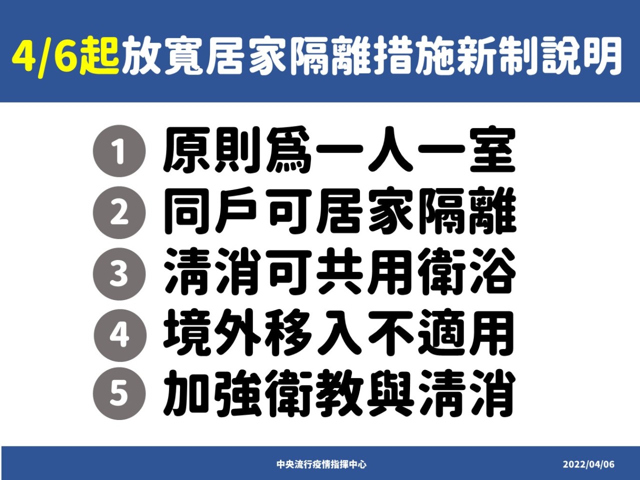 防疫宣傳 居家照護關懷手冊 防疫補助 勞工紓困 農漁畜牧 觀光紓困 企業紓困 租稅紓困 藝文紓困 中央各部會防疫專區 首頁 防疫宣傳 4/6起放寬居家隔離... 4/6起放寬居家隔離措施新制說明 公佈單位:新聞及行政處 發佈日期:111/4/7