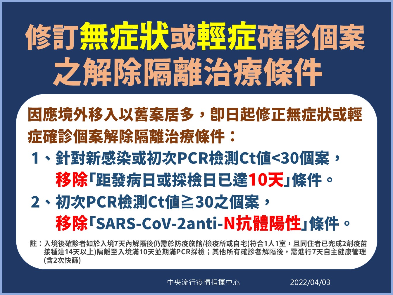 防疫宣傳 居家照護關懷手冊 防疫補助 勞工紓困 農漁畜牧 觀光紓困 企業紓困 租稅紓困 藝文紓困 中央各部會防疫專區 首頁 防疫宣傳 修訂無症狀或輕症確診... 修訂無症狀或輕症確診個案之解除隔離治療條件 公佈單位:新聞及行政處 發佈日期:111/4/7