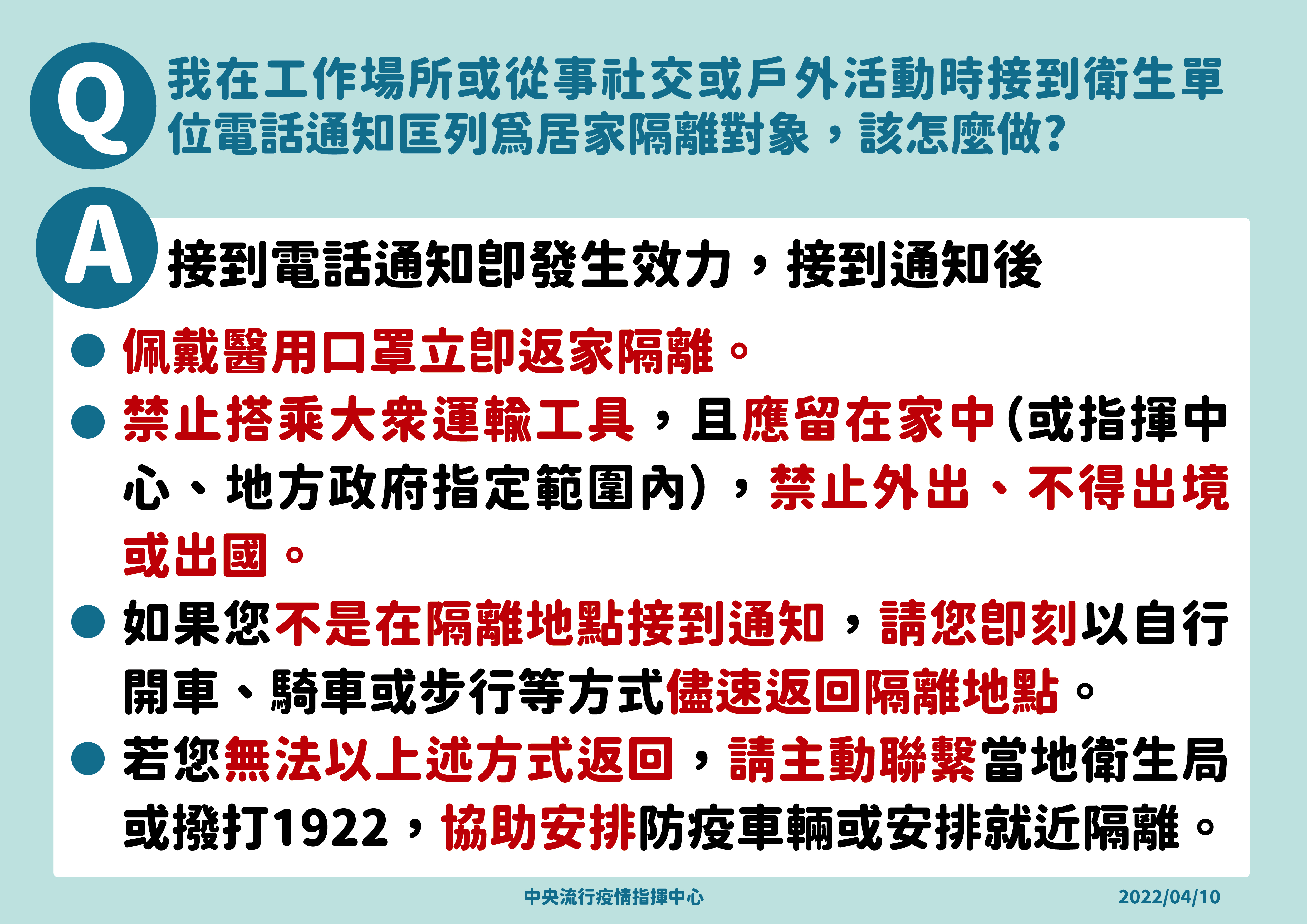 防疫宣傳 居家照護關懷手冊 防疫補助 勞工紓困 農漁畜牧 觀光紓困 企業紓困 租稅紓困 藝文紓困 中央各部會防疫專區 首頁 防疫宣傳 Q:我在工作場所或從... Q:我在工作場所或從事社交或戶外活動時接到衛生單位電話通知匡列為居家隔離對象,該怎麼做? 公佈單位:新聞及行政處 發佈日期:111/4/11