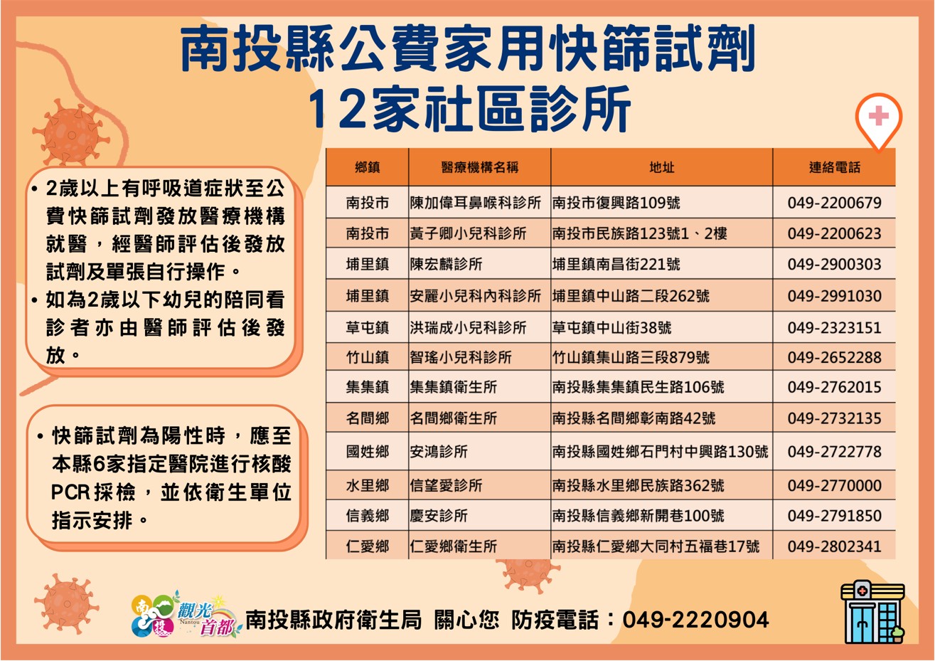 防疫宣傳 居家照護關懷手冊 防疫補助 勞工紓困 農漁畜牧 觀光紓困 企業紓困 租稅紓困 藝文紓困 中央各部會防疫專區 首頁 防疫宣傳 南投縣公費家用快篩試... 南投縣公費家用快篩試劑12家社區診所 公佈單位:新聞及行政處 發佈日期:111/4/12