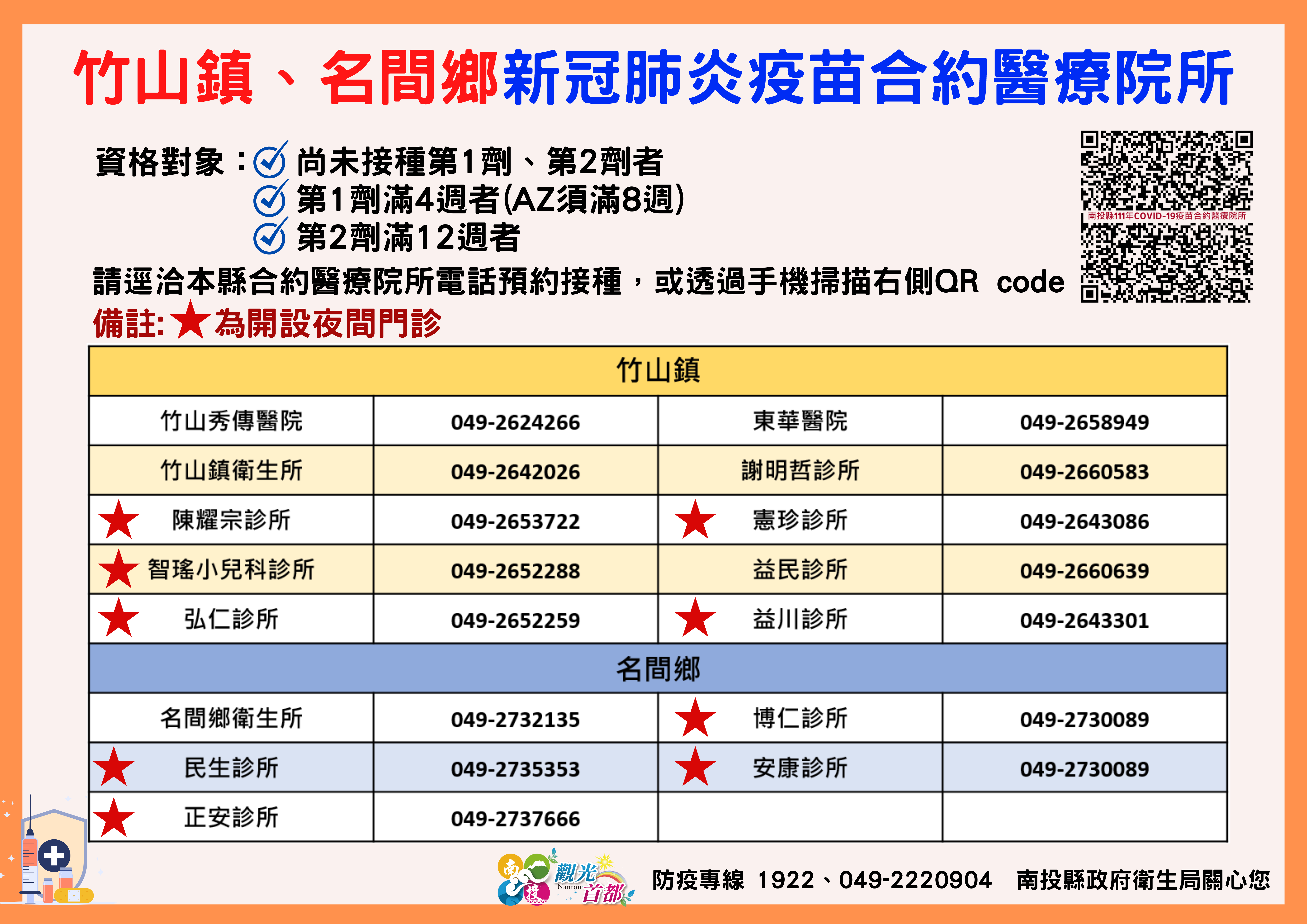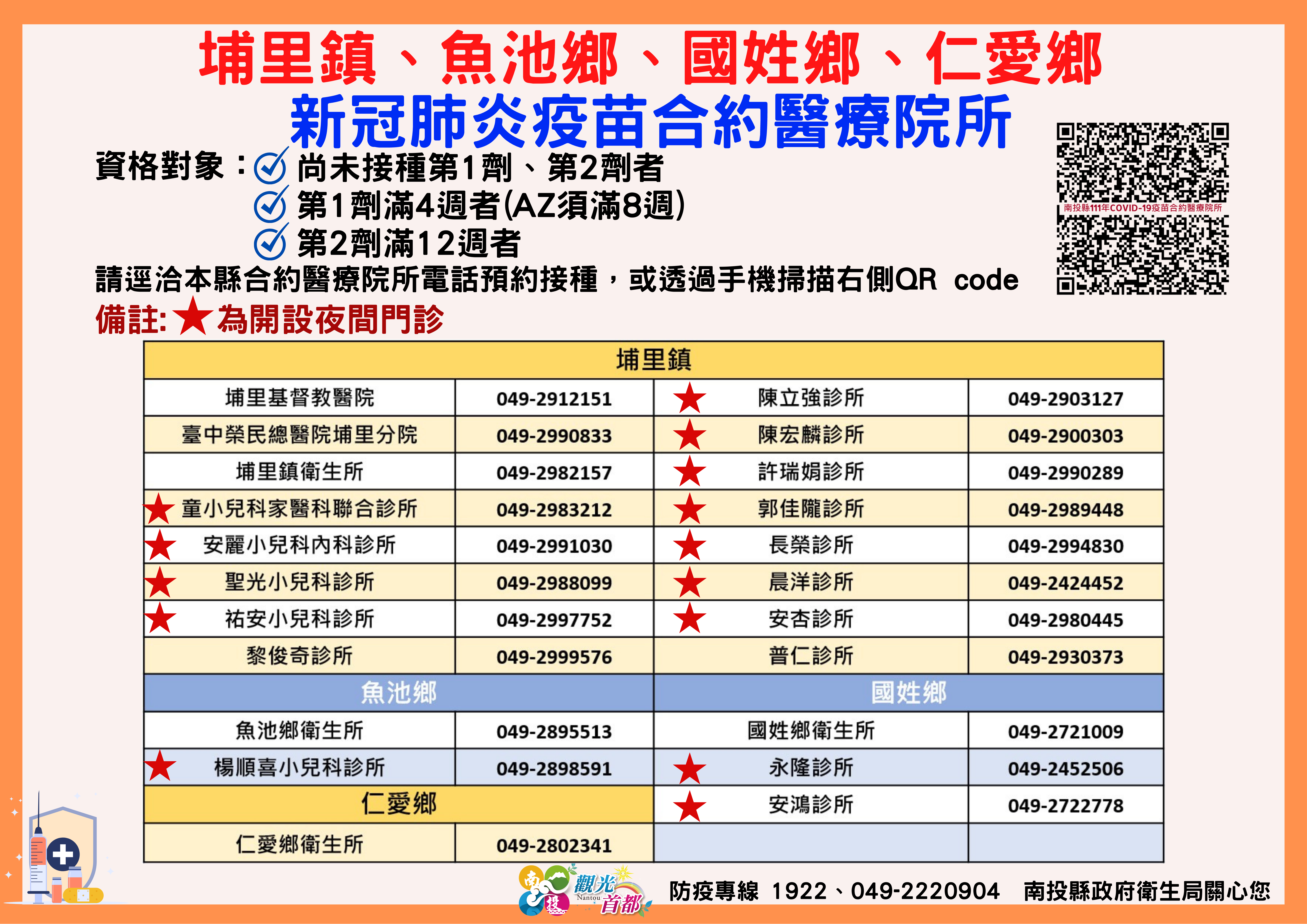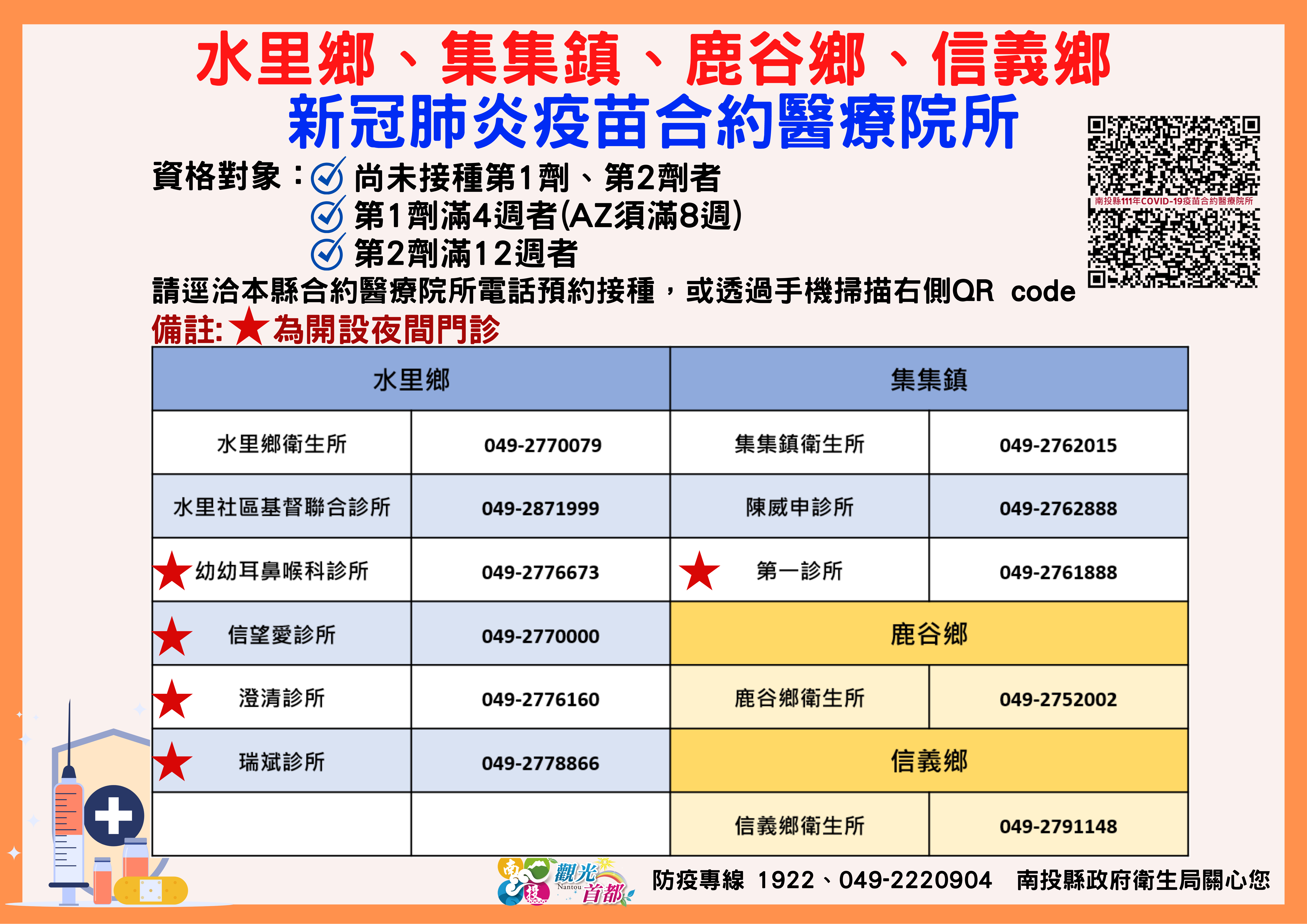 防疫宣傳 居家照護關懷手冊 防疫補助 勞工紓困 農漁畜牧 觀光紓困 企業紓困 租稅紓困 藝文紓困 中央各部會防疫專區 首頁 防疫宣傳 本縣各鄉鎮市新冠肺炎... 本縣各鄉鎮市新冠肺炎疫苗合約醫療院所 公佈單位:新聞及行政處 發佈日期:111/4/12