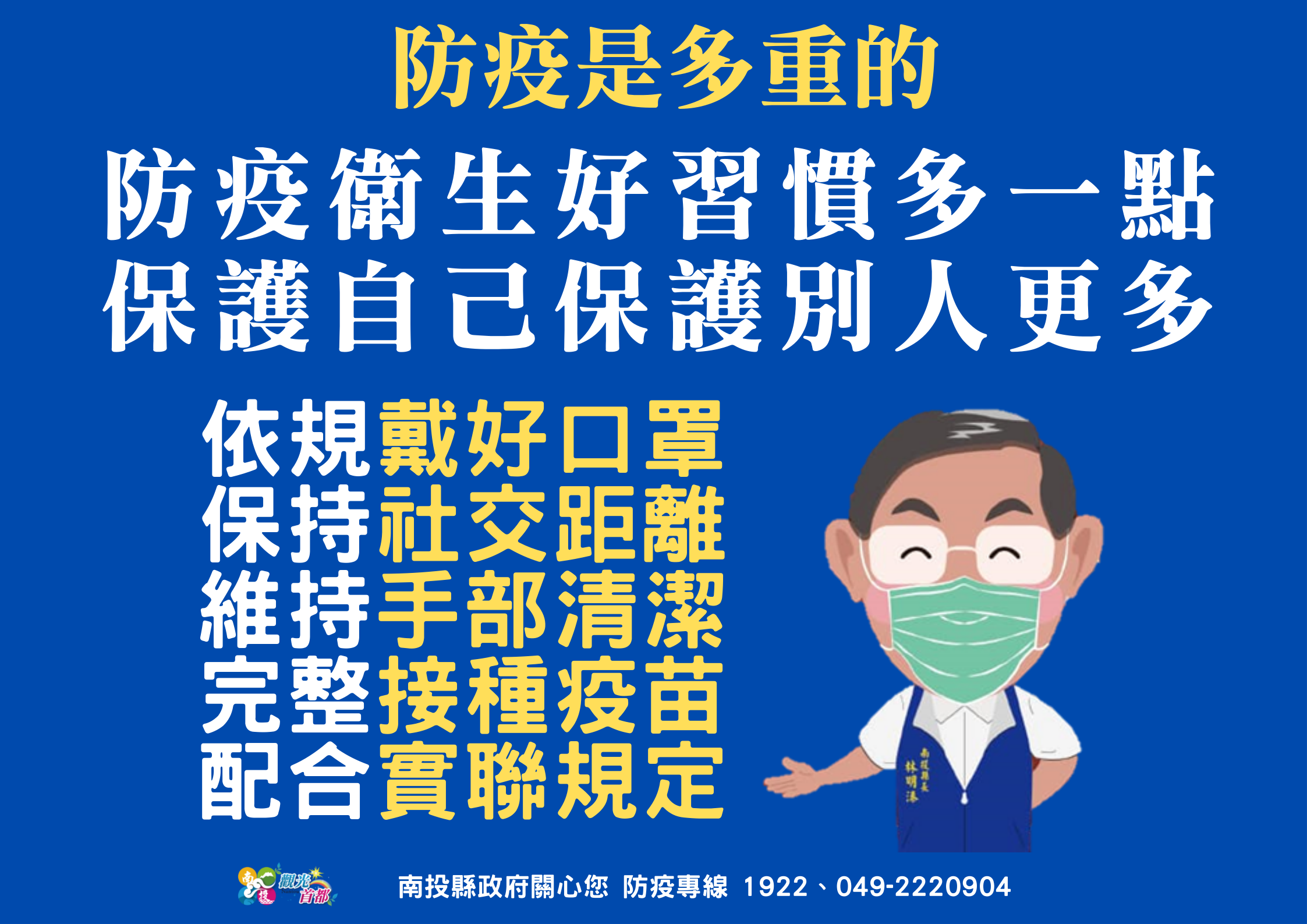 防疫宣傳 居家照護關懷手冊 防疫補助 勞工紓困 農漁畜牧 觀光紓困 企業紓困 租稅紓困 藝文紓困 中央各部會防疫專區 首頁 防疫宣傳 防疫是多重的 防疫是多重的 公佈單位:新聞及行政處 發佈日期:111/4/14