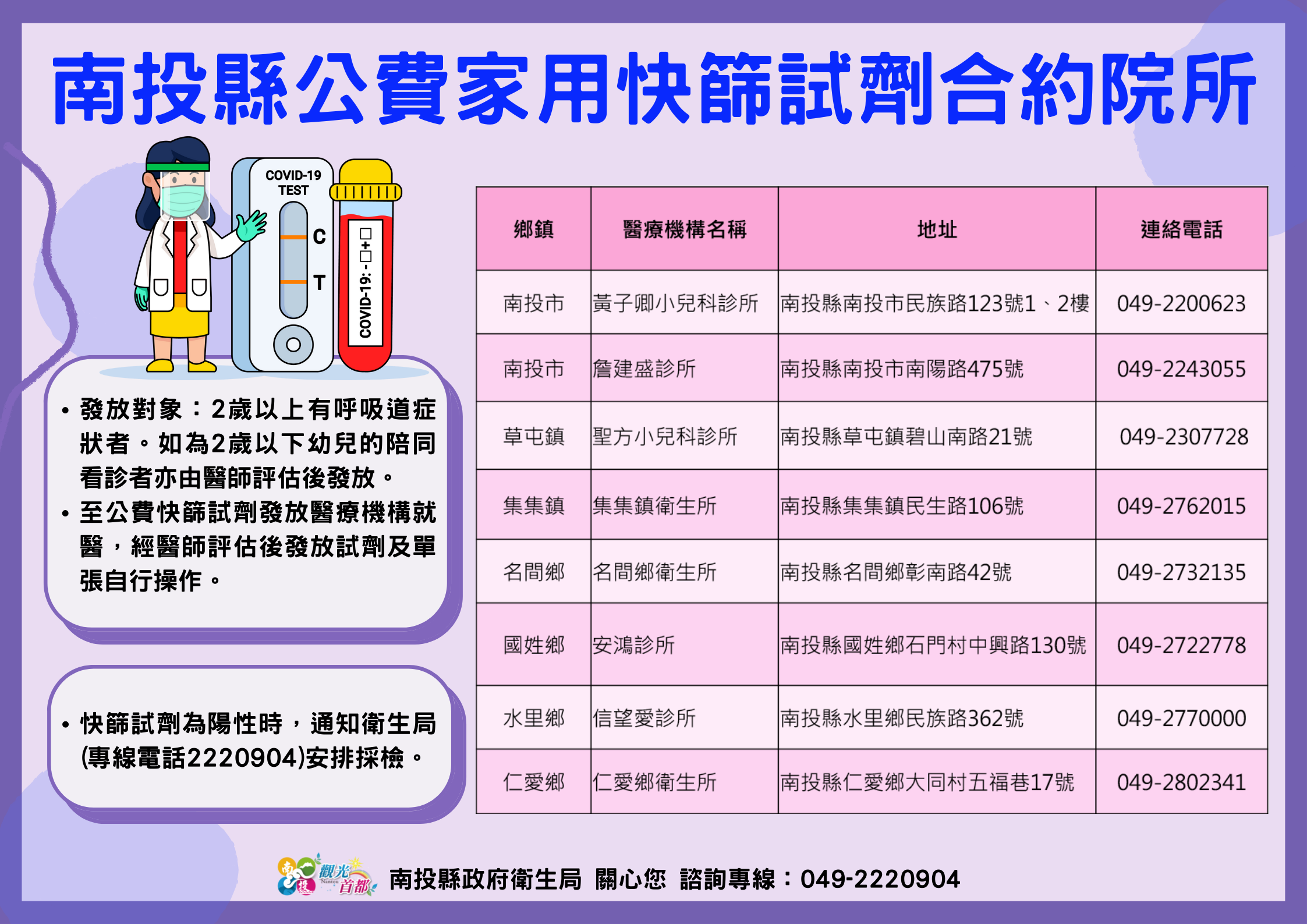 防疫宣傳 居家照護關懷手冊 防疫補助 勞工紓困 農漁畜牧 觀光紓困 企業紓困 租稅紓困 藝文紓困 中央各部會防疫專區 首頁 防疫宣傳 南投縣公費家用快篩試... 南投縣公費家用快篩試劑合約院所 公佈單位:新聞及行政處 發佈日期:111/4/14