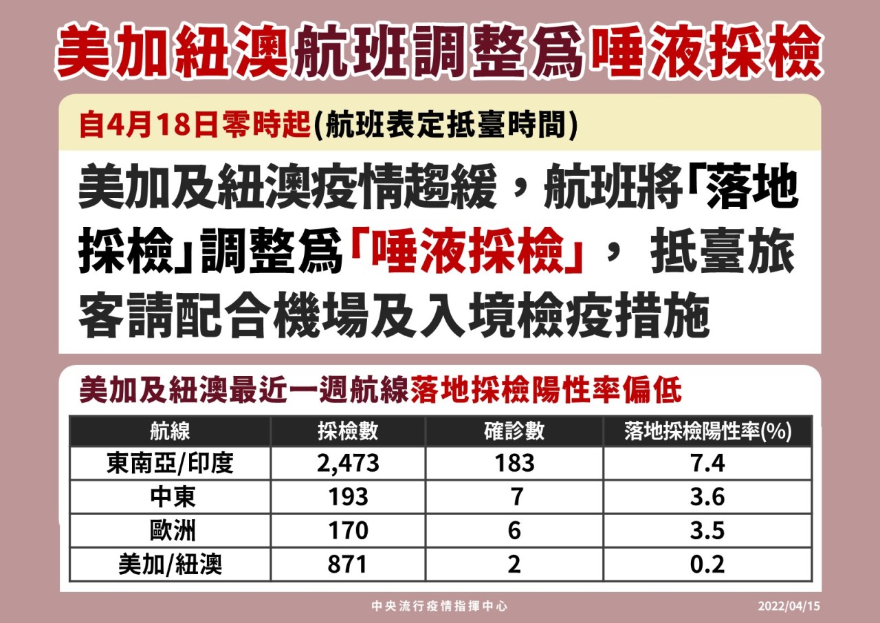 防疫宣傳 居家照護關懷手冊 防疫補助 勞工紓困 農漁畜牧 觀光紓困 企業紓困 租稅紓困 藝文紓困 中央各部會防疫專區 首頁 防疫宣傳 自4月18日零時起 ... 自4月18日零時起 美加紐澳航班調整為唾液採檢 公佈單位:新聞及行政處 發佈日期:111/4/15