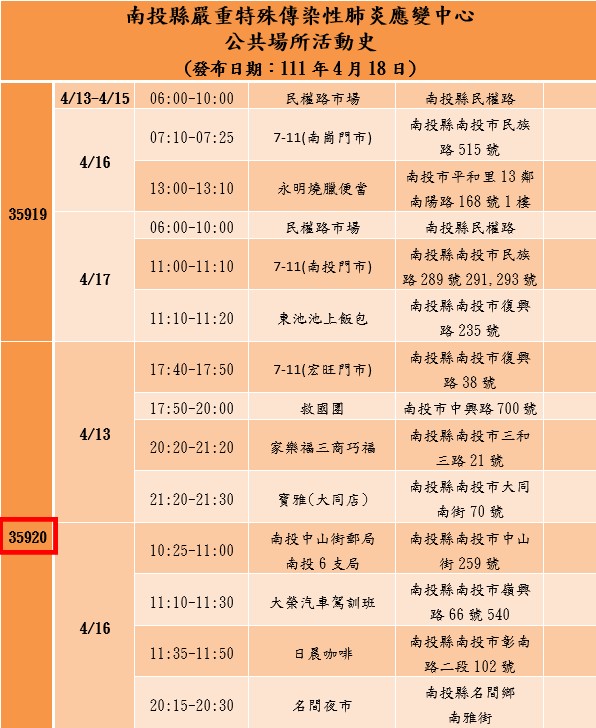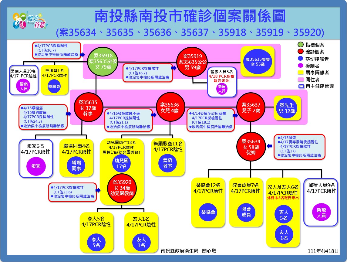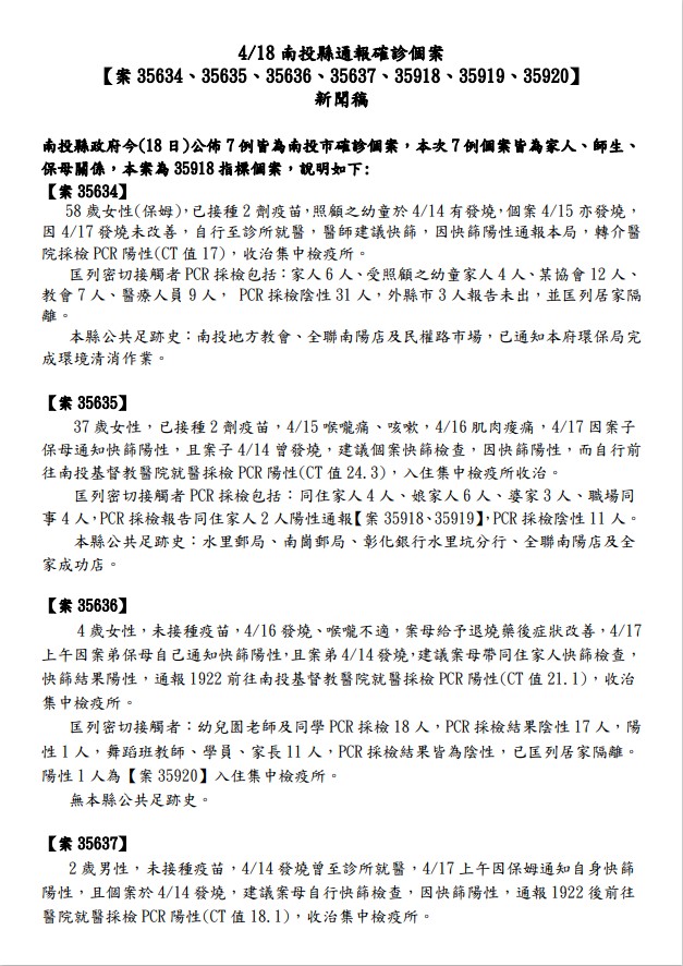 防疫宣傳 居家照護關懷手冊 防疫補助 勞工紓困 農漁畜牧 觀光紓困 企業紓困 租稅紓困 藝文紓困 中央各部會防疫專區 首頁 防疫宣傳 南投縣通報確診個案【... 南投縣通報確診個案【案35634、35635、35636、35637、35918、35919、35920】新聞稿、關係圖、公共場所活動史 公佈單位:新聞及行政處 發佈日期:111/4/18