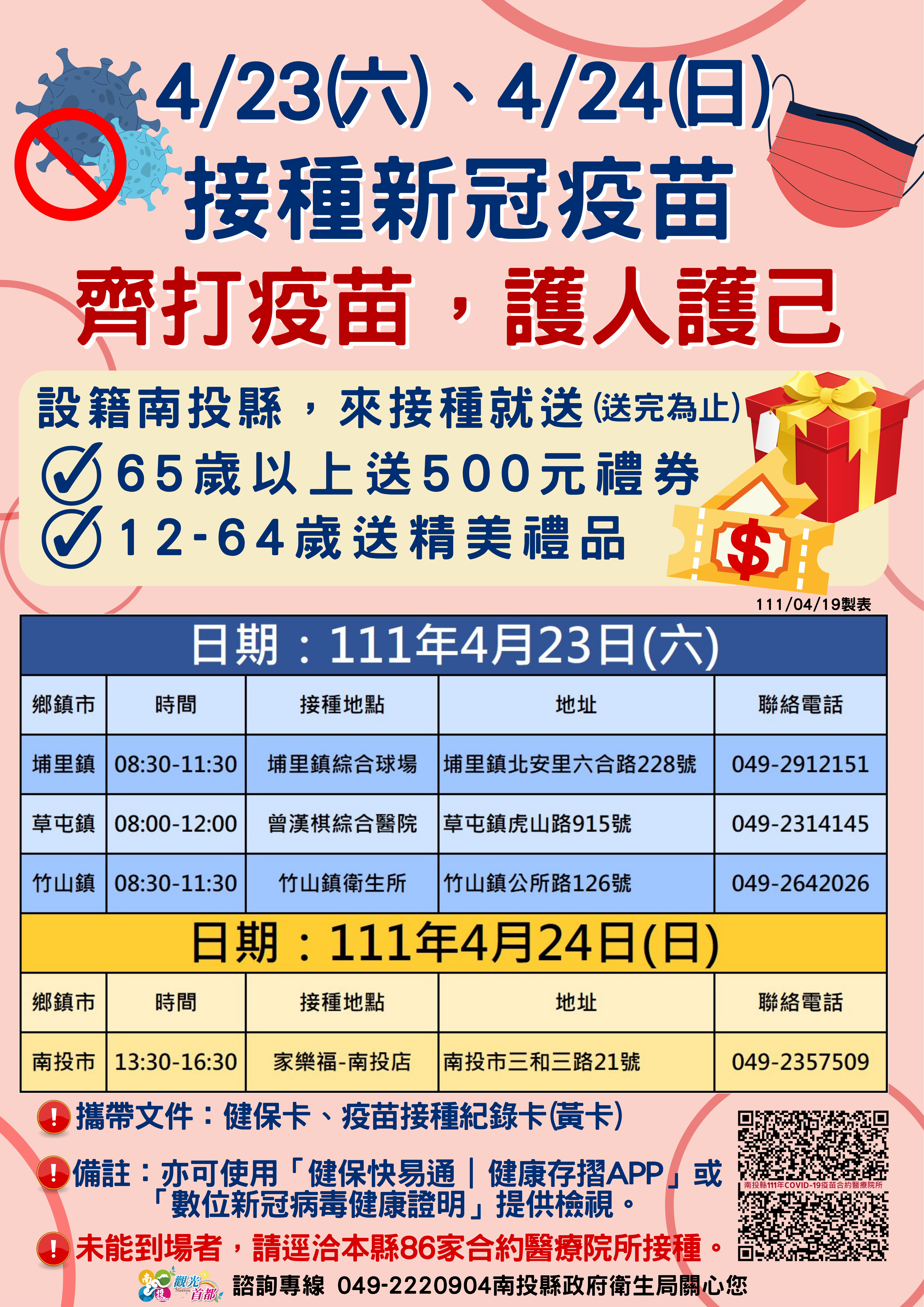 防疫宣傳 居家照護關懷手冊 防疫補助 勞工紓困 農漁畜牧 觀光紓困 企業紓困 租稅紓困 藝文紓困 中央各部會防疫專區 首頁 防疫宣傳 4/23(六)... 4/23(六)、4/24 (日) 接種新冠疫苗 齊打疫苗,護人護已 公佈單位:新聞及行政處 發佈日期:111/4/21
