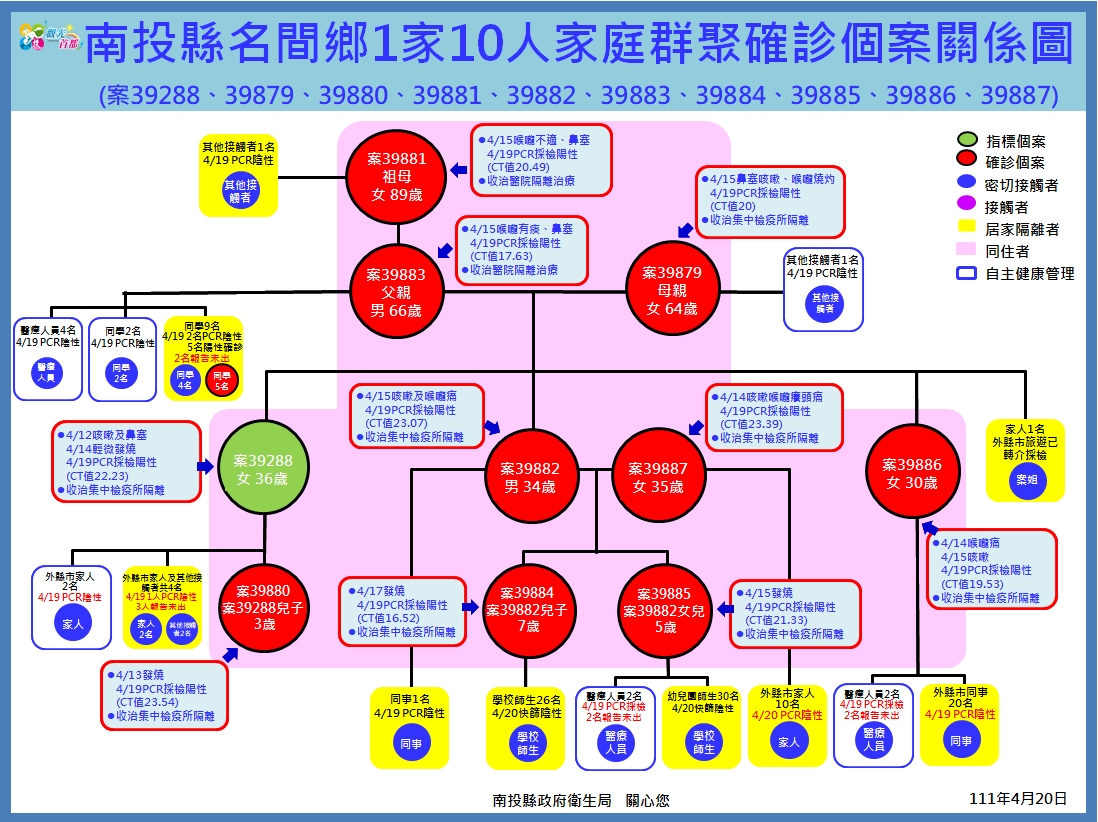 防疫宣傳 居家照護關懷手冊 防疫補助 勞工紓困 農漁畜牧 觀光紓困 企業紓困 租稅紓困 藝文紓困 中央各部會防疫專區 首頁 防疫宣傳 南投縣名間鄉1家10... 南投縣名間鄉1家10人家庭群聚確診個案關係圖 公佈單位:新聞及行政處 發佈日期:111/4/21