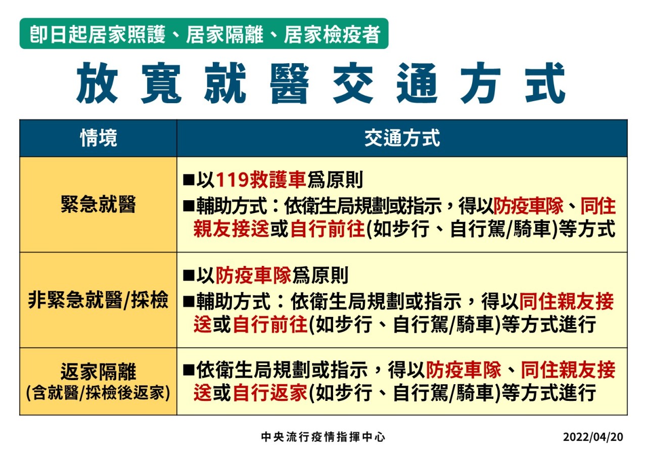 防疫宣傳 居家照護關懷手冊 防疫補助 勞工紓困 農漁畜牧 觀光紓困 企業紓困 租稅紓困 藝文紓困 中央各部會防疫專區 首頁 防疫宣傳 即日起居家照顧... 即日起居家照顧、居家隔離、居家檢疫者 放寬就醫交通方式 公佈單位:新聞及行政處 發佈日期:111/4/21