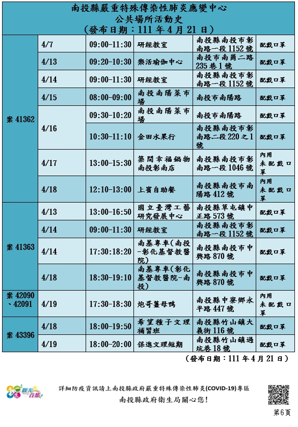 4/21 南投縣通報確診個案 新聞稿【案40363 、 40364 、41359、 41360 、 41361 、 41362 、 41363 、 42090 、 42091 、 42092 、 43396 、 43397 】