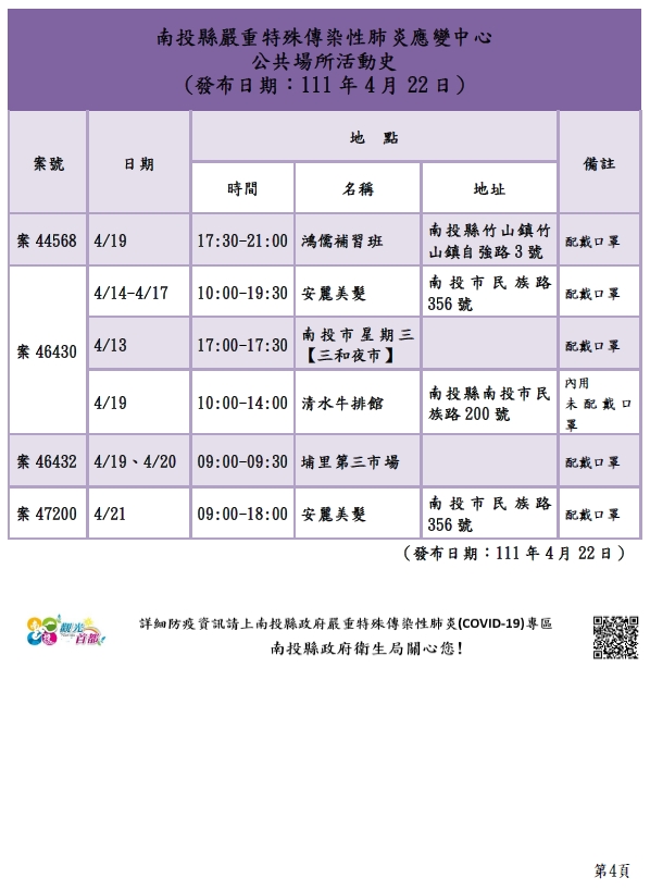 4/22南投縣通報確診個案新聞稿【案44566、44567、44568、45552、46430、46431、46432、46433、47200】