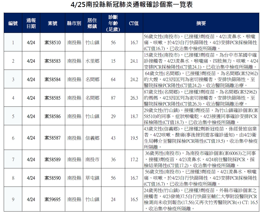 南投縣政府今(4/25)公布18例確診個案,疫情說明如下:10例疑為職場感染【案58510、58586、58587、58589、59695、60063、61204、61205、61207、61208】。