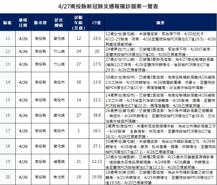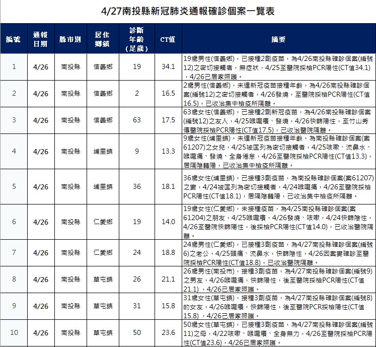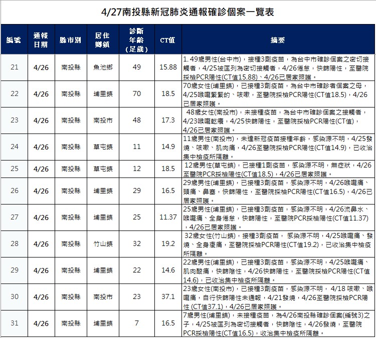 南投縣政府今(4/27)公布35例確診個案,其中4例為外縣市個案已轉回當地衛生局,南投縣確診個案(31例),11例疑為家庭感染、10例其他感染源、9例疑為朋友感染、1例疑為職場感染。本日居家隔離期間陰轉陽的個案有4例,衛生局提醒民眾,身體若有任何不適症狀,請到南投縣發放公費快篩試劑之診所,經醫師評估拿取快篩試劑返回家中篩檢,倘快篩結果為陽性,請撥打衛生局防疫專線049-2220904,協助轉介至醫院採檢PCR,或使用塑膠袋攜帶陽性快篩試劑至各家醫院急診室。