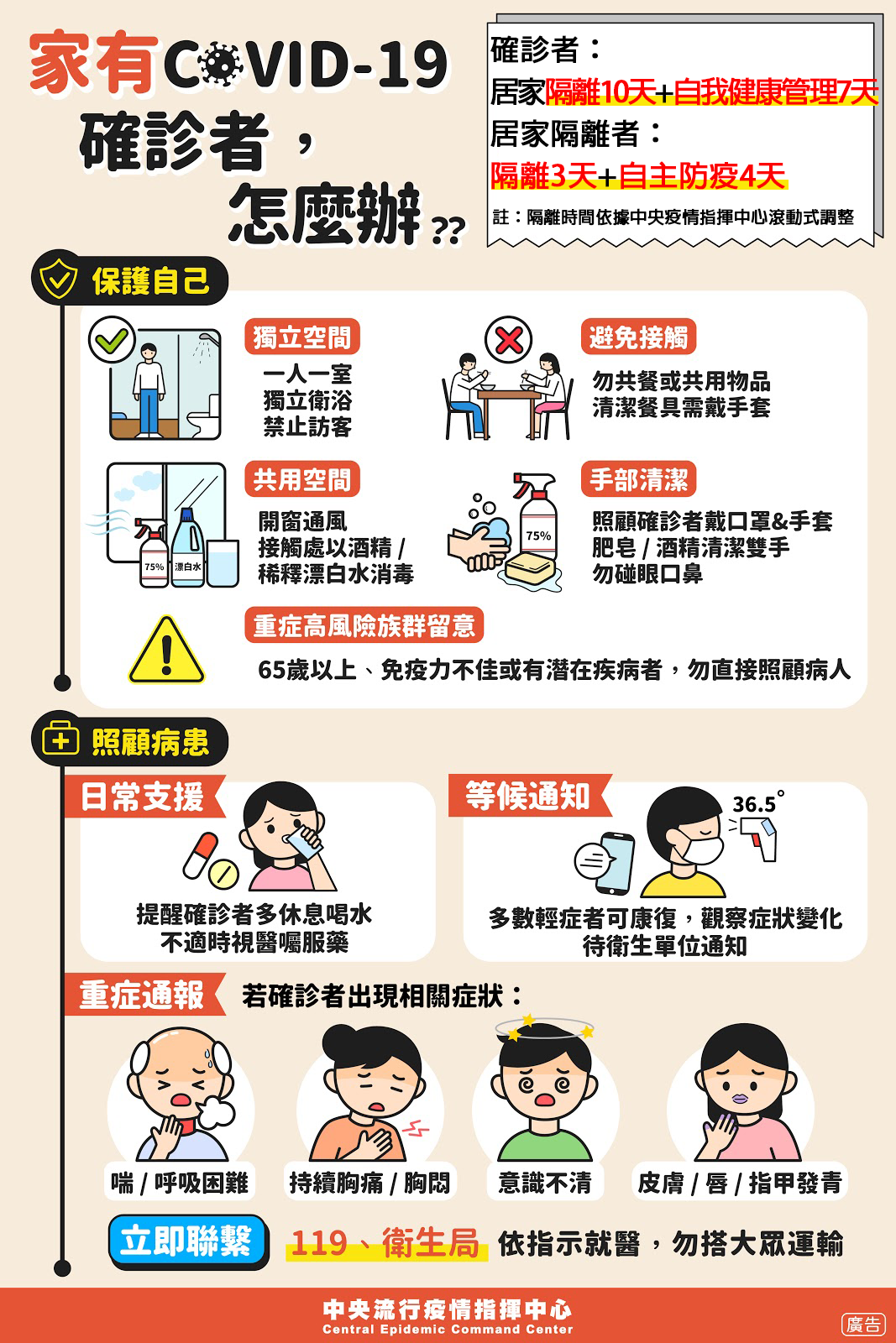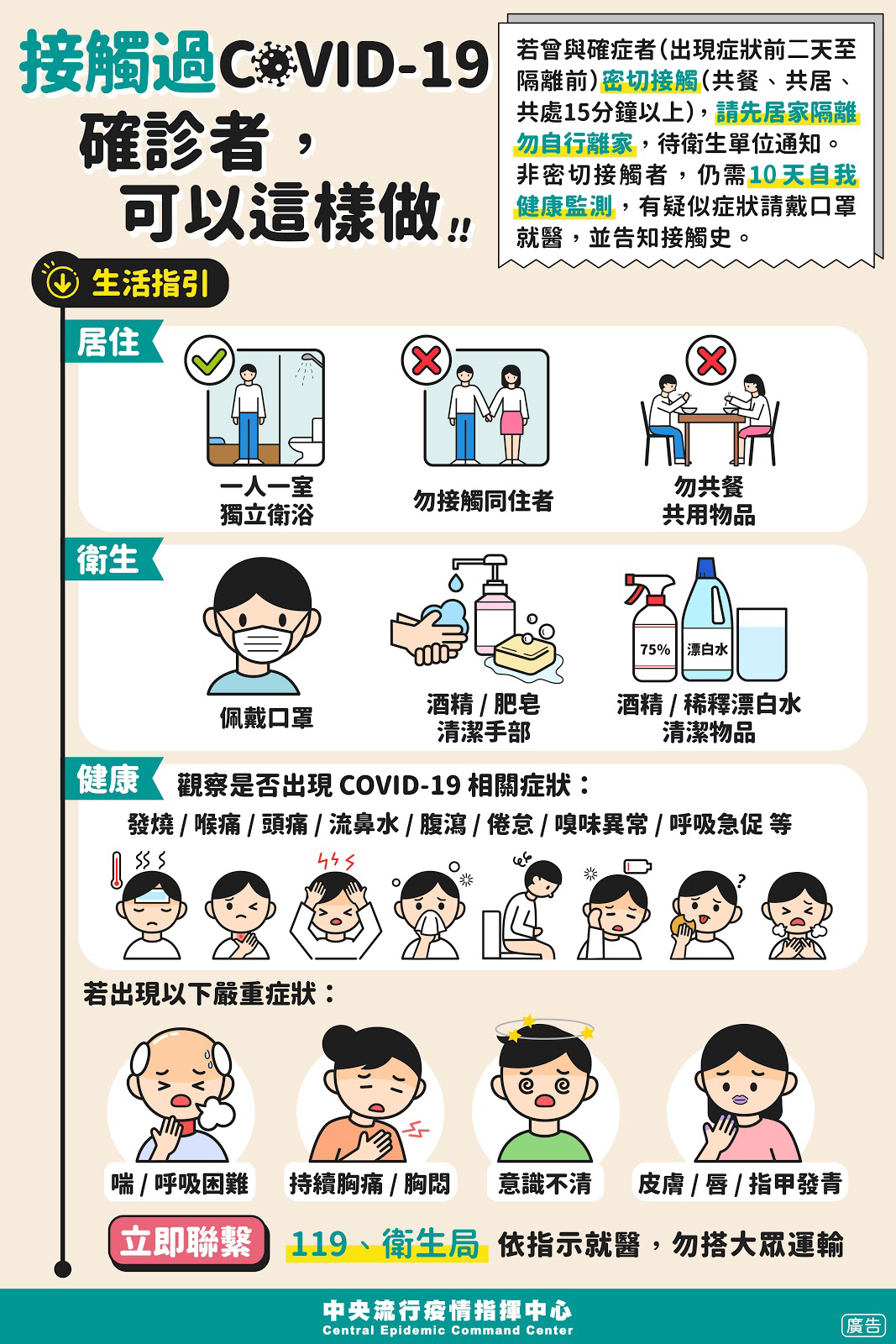防疫宣傳 居家照護關懷手冊 防疫補助 勞工紓困 農漁畜牧 觀光紓困 企業紓困 租稅紓困 藝文紓困 中央各部會防疫專區 首頁 防疫宣傳 接觸過、... 接觸過、家有、確診COVID-19可以這樣做、怎麼辦! ! 公佈單位:新聞及行政處 發佈日期:111/4/27