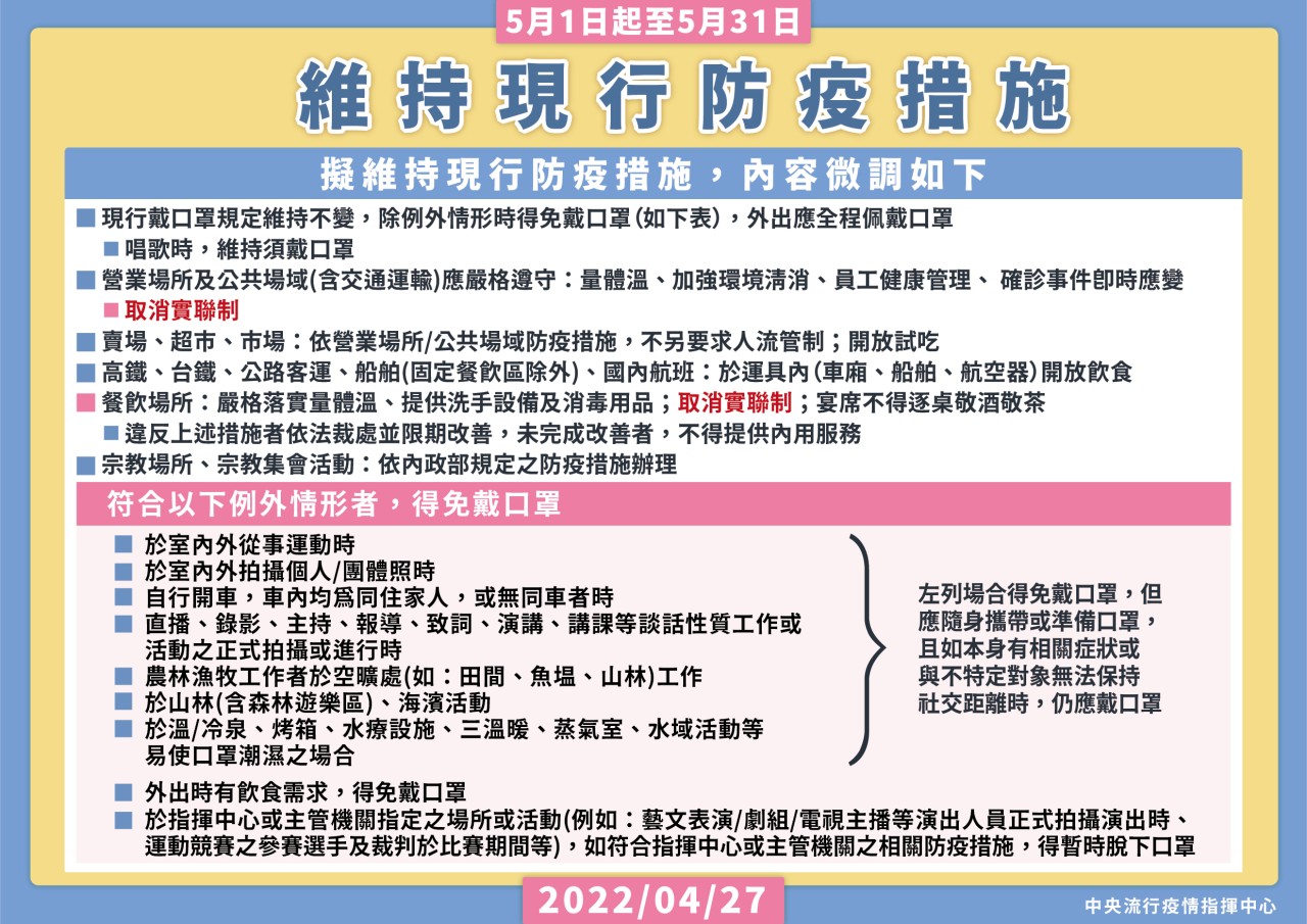 防疫宣傳 居家照護關懷手冊 防疫補助 勞工紓困 農漁畜牧 觀光紓困 企業紓困 租稅紓困 藝文紓困 中央各部會防疫專區 首頁 防疫宣傳 5/1起至5/31維... 5/1起至5/31維持現行防疫措施(取消實聯制) 公佈單位:新聞及行政處 發佈日期:111/4/28