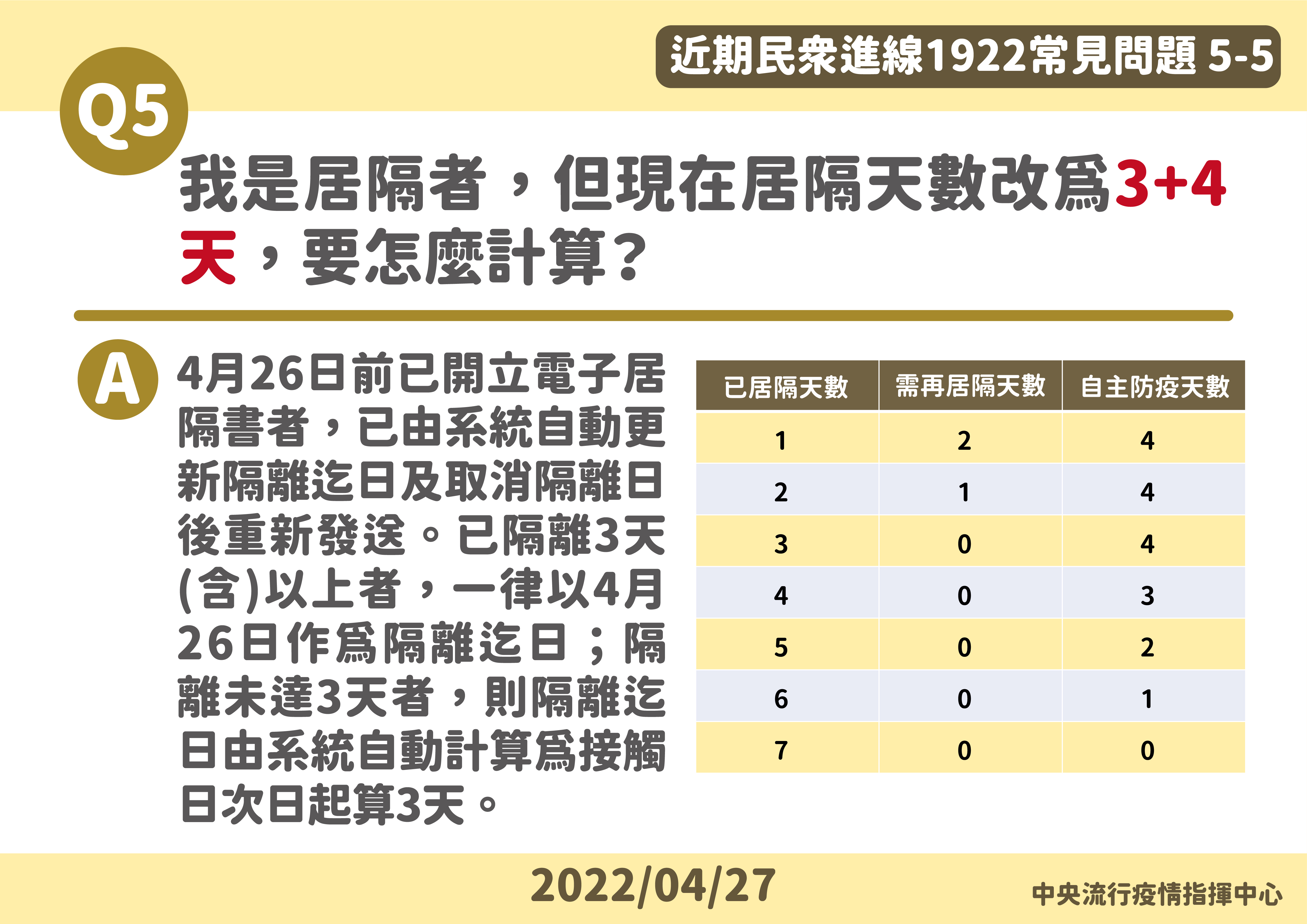 衛生局表示倘為居隔者,但因現在居隔天數改為3+4天,要怎麼計算? 4月26日前已開立電子居隔書者,已由系統自動更新隔離迄日及取消隔離日後重新發送。已隔離3天(含)以上者,一律以4月26日作為隔離迄日;隔離未達3天者,則隔離迄日由系統自動計算為接觸日次日起算3天。先前開立居家隔離單起訖日期,本府衛生局會再函文通知隔離者於4月26日自動解除隔離,另請民眾依據中央疫情指揮中心「3隔離+4自主防疫」新規定,延續或解除4天自主健康管理。