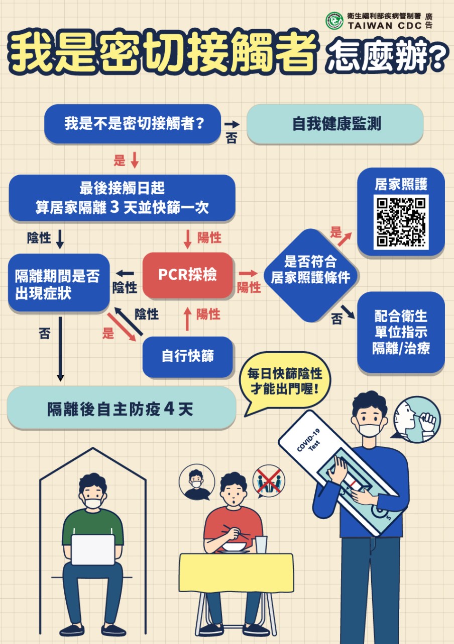 防疫宣傳 居家照護關懷手冊 防疫補助 勞工紓困 農漁畜牧 觀光紓困 企業紓困 租稅紓困 藝文紓困 中央各部會防疫專區 首頁 防疫宣傳 我是密切接觸者 怎麼... 我是密切接觸者 怎麼辦? 公佈單位:新聞及行政處 發佈日期:111/4/29