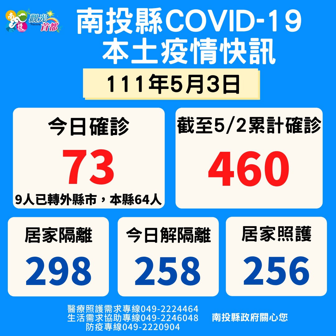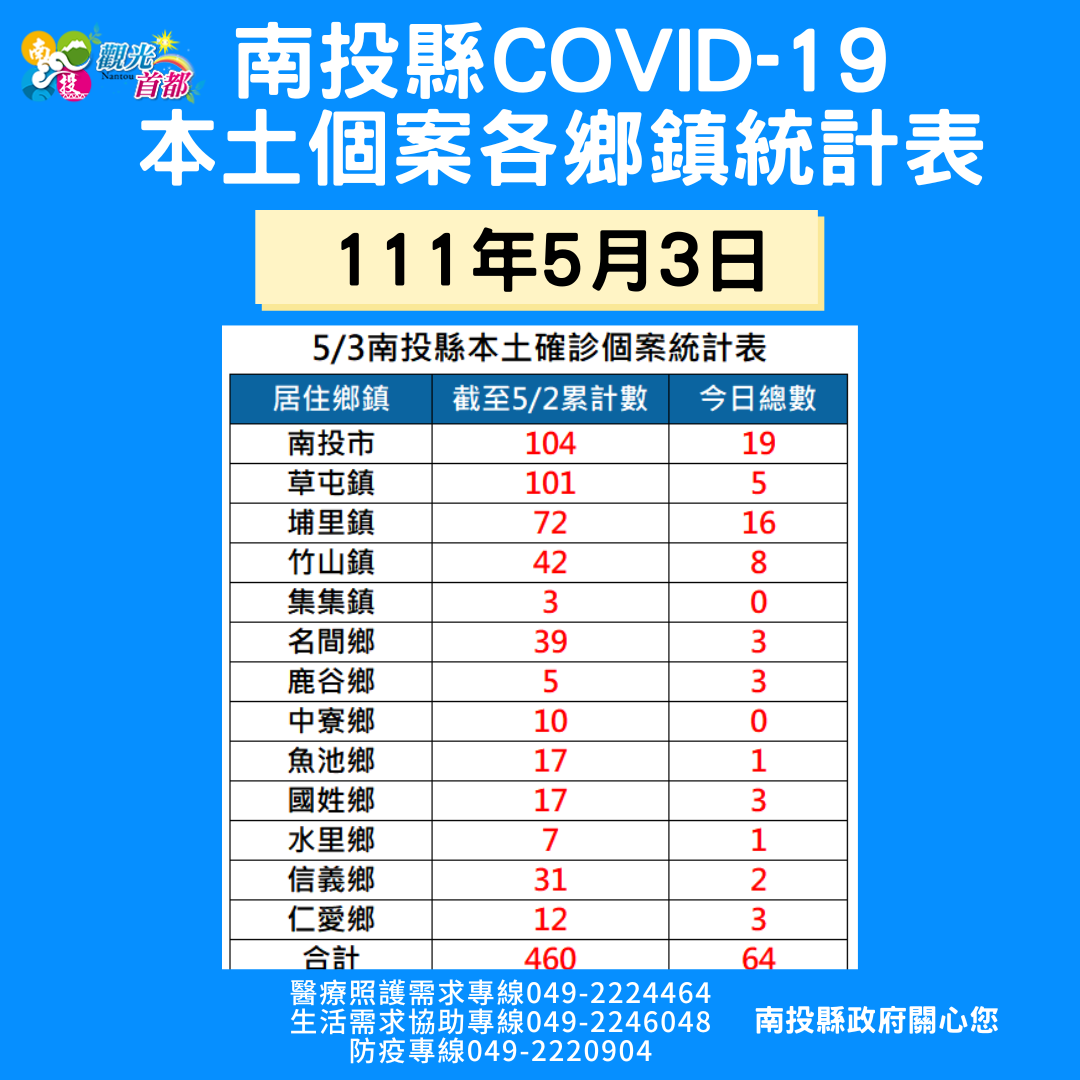防疫宣傳 居家照護關懷手冊 防疫補助 勞工紓困 農漁畜牧 觀光紓困 企業紓困 租稅紓困 藝文紓困 中央各部會防疫專區 首頁 防疫宣傳 111年5月3日南投... 111年5月3日南投縣疫情快訊 公佈單位:新聞及行政處 發佈日期:111/5/3