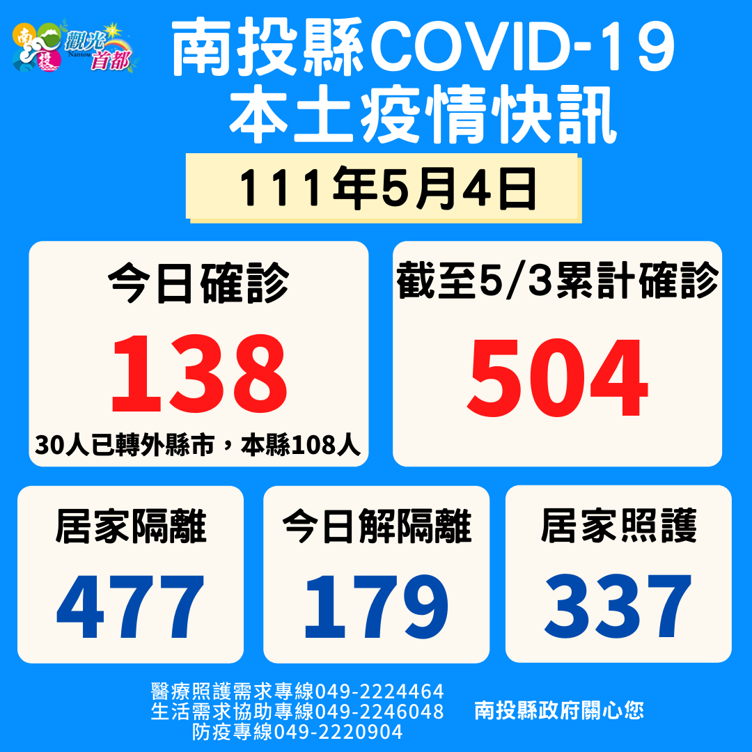 防疫宣傳 居家照護關懷手冊 防疫補助 勞工紓困 農漁畜牧 觀光紓困 企業紓困 租稅紓困 藝文紓困 中央各部會防疫專區 首頁 防疫宣傳 111年5月5日南投... 111年5月5日南投縣疫情快訊 公佈單位:新聞及行政處 發佈日期:111/5/6