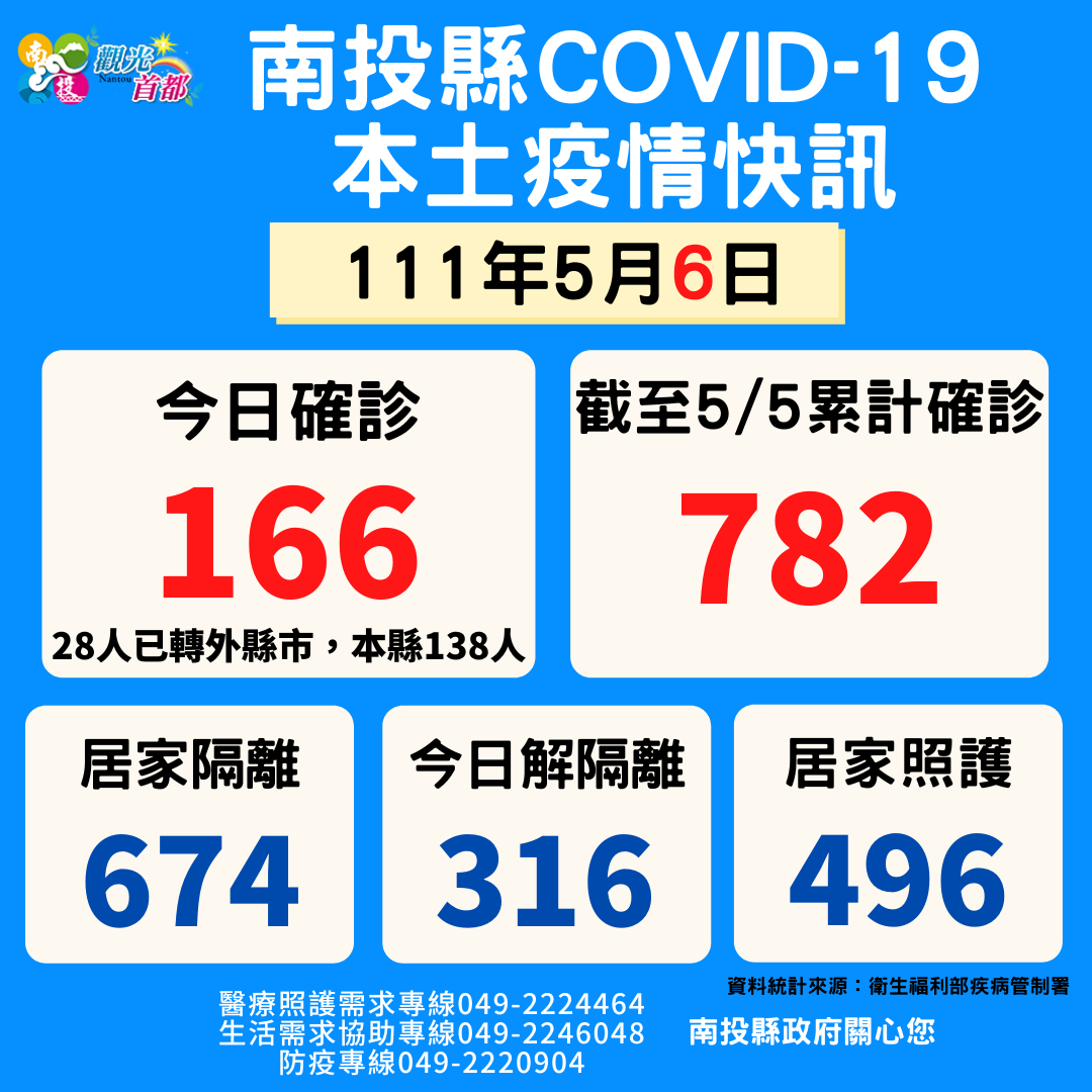 防疫宣傳 居家照護關懷手冊 防疫補助 勞工紓困 農漁畜牧 觀光紓困 企業紓困 租稅紓困 藝文紓困 中央各部會防疫專區 首頁 防疫宣傳 111年5月6日南投... 111年5月6日南投縣疫情快訊 公佈單位:新聞及行政處 發佈日期:111/5/6