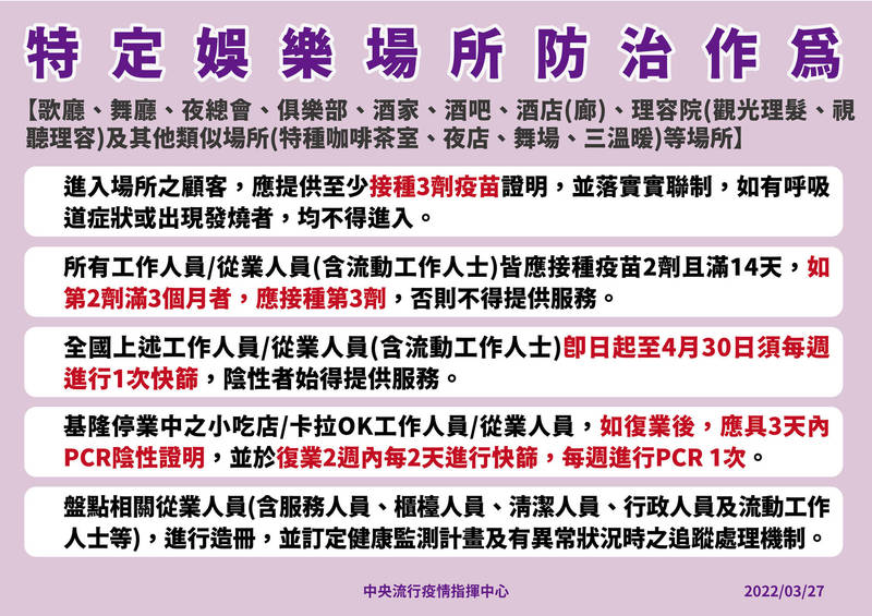 防疫宣傳 居家照護關懷手冊 防疫補助 勞工紓困 農漁畜牧 觀光紓困 企業紓困 租稅紓困 藝文紓困 中央各部會防疫專區 首頁 防疫宣傳 特定娛樂場所防治作為 特定娛樂場所防治作為 公佈單位:新聞及行政處 發佈日期:111/5/6