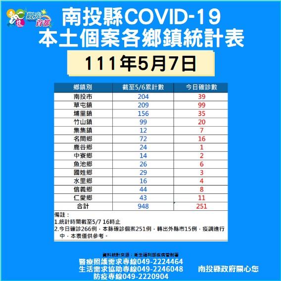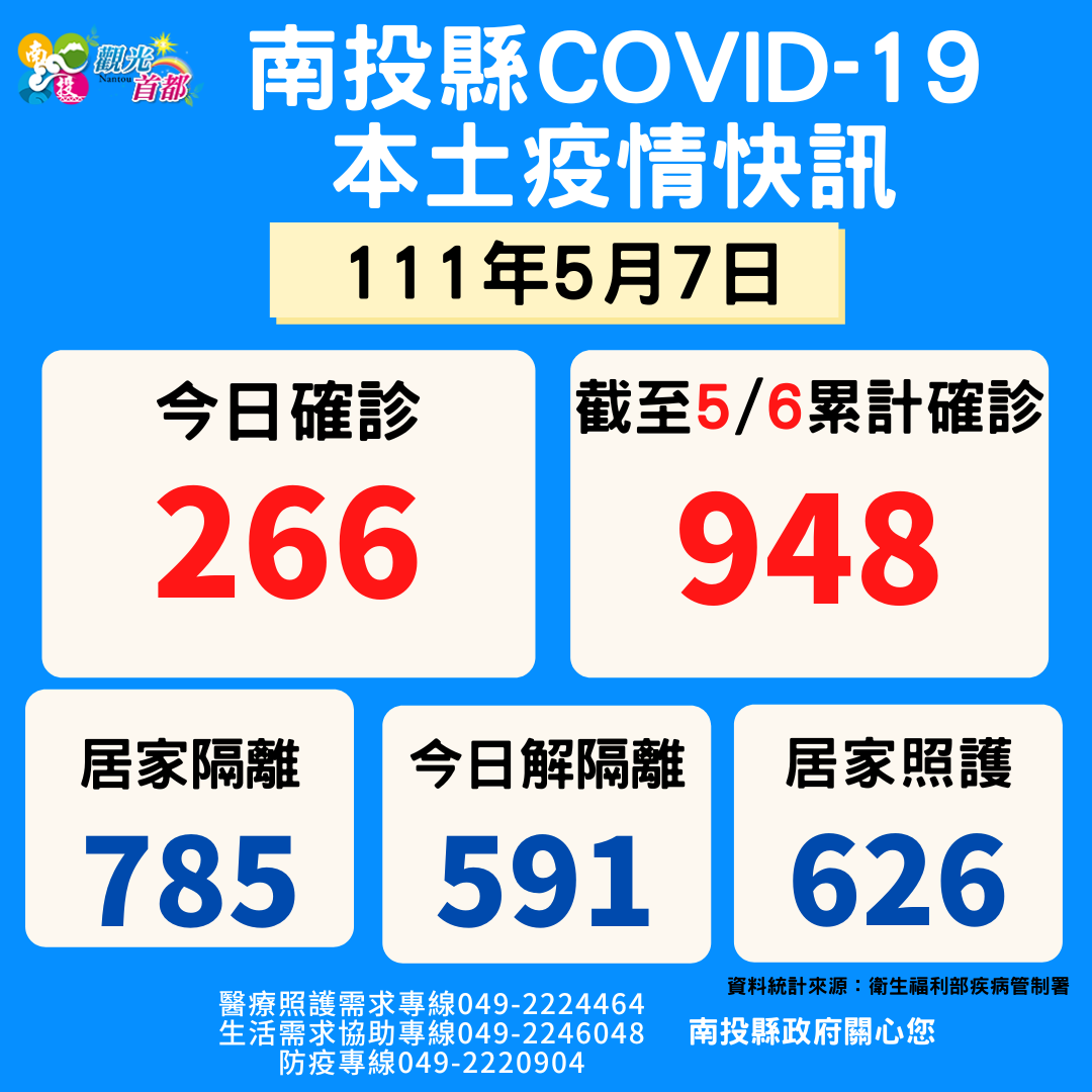 防疫宣傳 居家照護關懷手冊 防疫補助 勞工紓困 農漁畜牧 觀光紓困 企業紓困 租稅紓困 藝文紓困 中央各部會防疫專區 首頁 防疫宣傳 111年5月7日南投... 111年5月7日南投縣疫情快訊 公佈單位:新聞及行政處 發佈日期:111/5/9